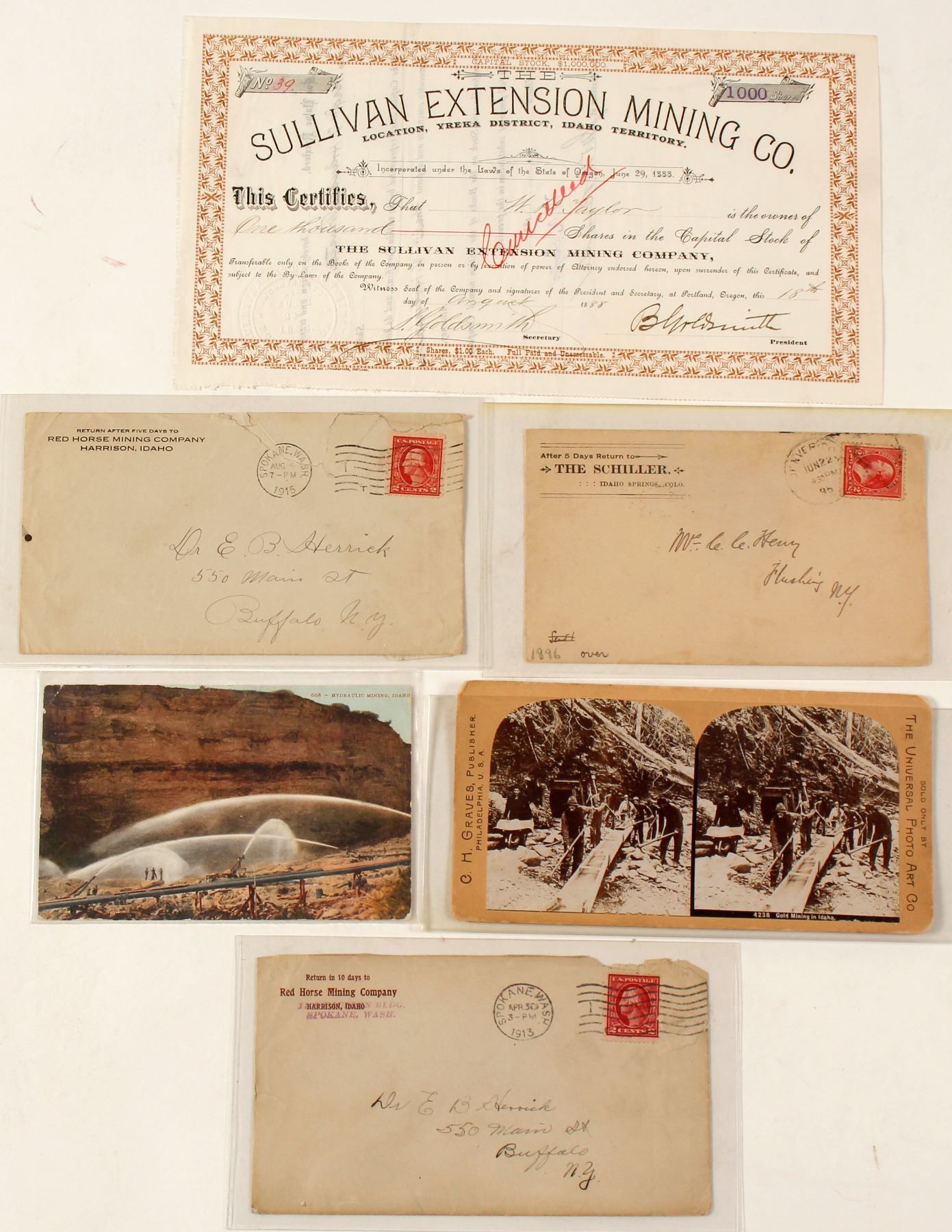 Lot of 6. 1) Sullivan Extension Mining Co. stock certificate. Yreka District, Idaho Territory. Issued in 1888 for 1,00 shares. Pen cancelled. Very fine condition. 2) Three advertising covers: two different for Red Horse Mining Co. (Harrison, ID, 1913) and one for The Schiller (Idaho Springs, CO, 1896). 3) CH Graves stereoview No. 4238. "Gold Mining in Idaho." Men working a sluice box outside of a mine tunnel entrance. 4) One postcard showing hydraulic mining in Idaho (1908 Rigby).