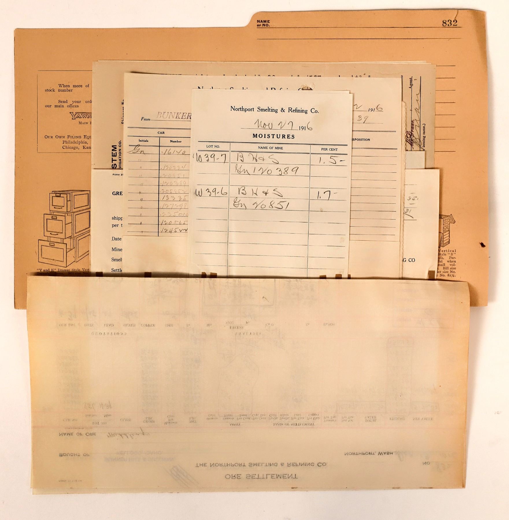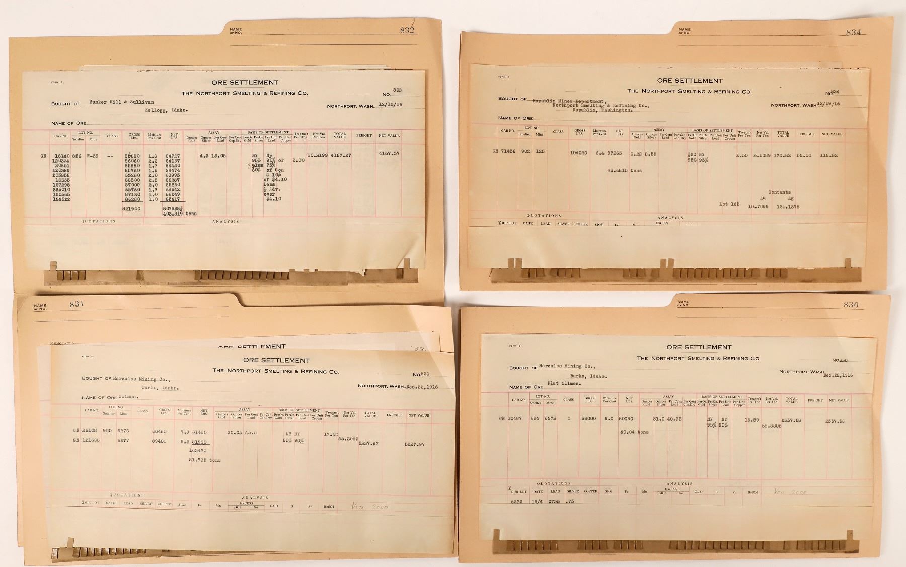 Ore Settlement reports, assay, freight records from Northern Smelting and Refinement, c.1916 Idaho
