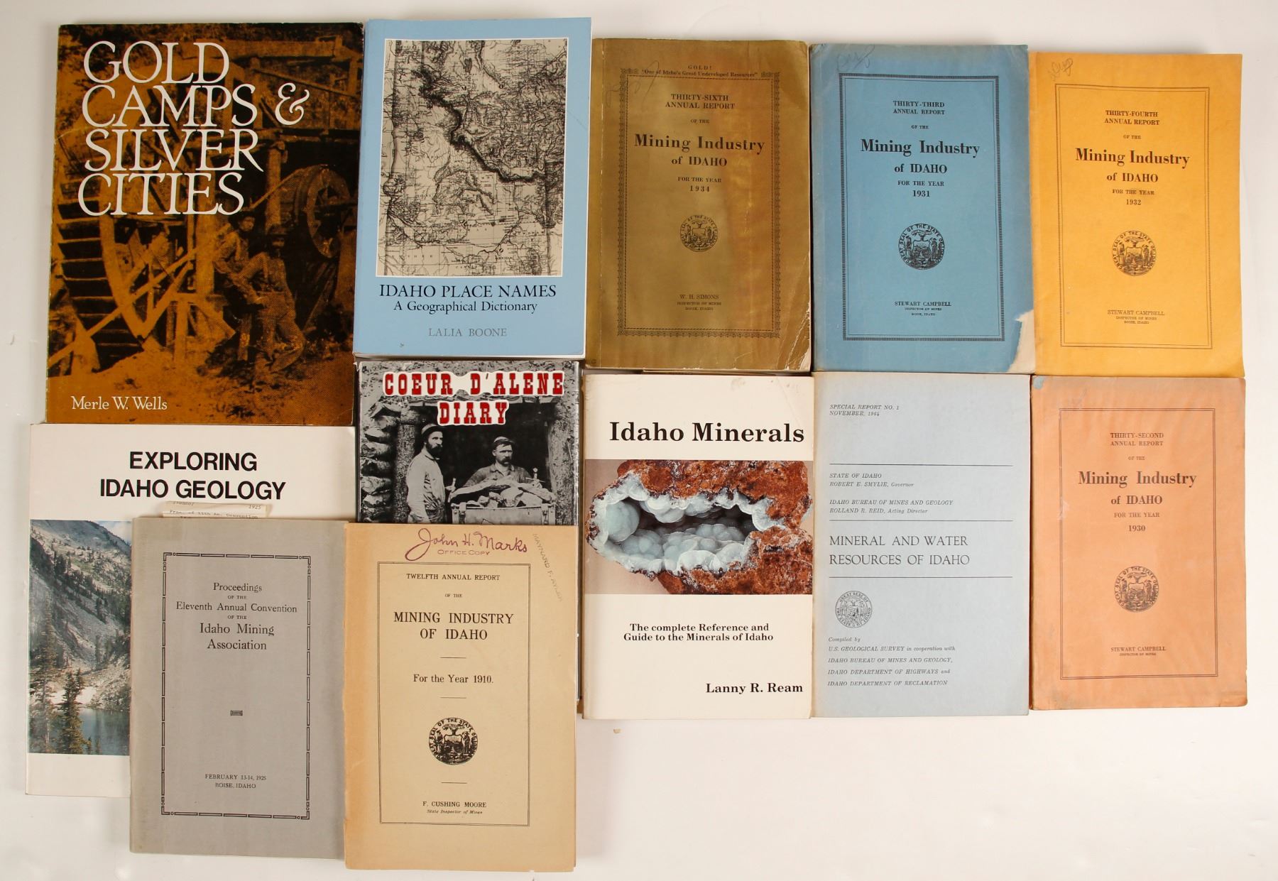 Small library of eleven mining references for Idaho. Important group for any research library. Four volumes of Idaho's annual Mining Industry Reports, 1930, 31, 32, 34; Coeur D'Alene Diary; Idaho Place Names; Exploring Idaho Geology; Gold Camps and Silver Cities; Idaho Minerals, others.