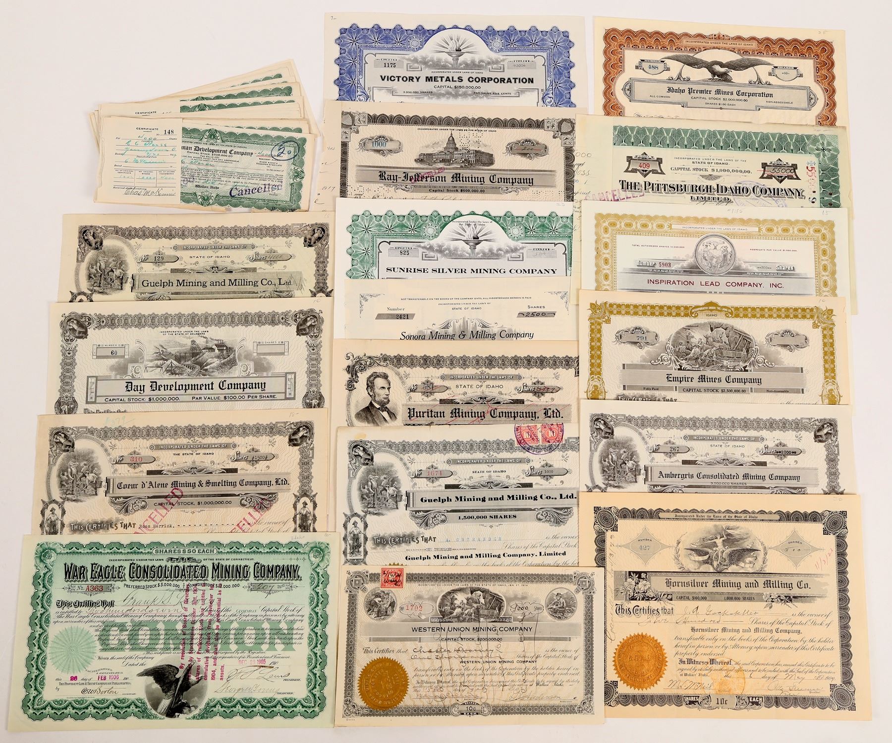 Lot of 45. Includes: War Eagle Consolidated Mining Company (1905); Western Union Mining Co. (1921); Hornsilver Mining & Milling Co. (1909); Ambergris Cons. Mining Co. (1929); Empire Mines Co. (uniss.); Inspiration Lead Co. (1946); Idaho Premier Mines Corp. (1929); Pittsburgh-Idaho Co. (1911); Coeur d'Alene Mining & Smelting Co. (1924); Guelph Mining & Milling Co. (1910 & 1924); Puritan Mining Co. (1924); Sonora Mining & Milling Co. (1939); Sunrise Silver MC (1926); Day Development Co. (uniss.); Ray-Jefferson MC (1919); Victory Metals Corp. (1942); and Sherman Development Co. (28 stocks, 1917).