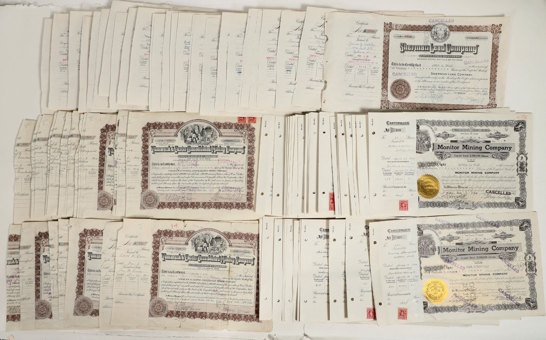 Mining company stock certificates in Idaho, contains about 40 Sherman lead company, about 40 Tamarack & Custer consolidated mining company, and about 60 Monitor mining company capital stock certificates. See photo.