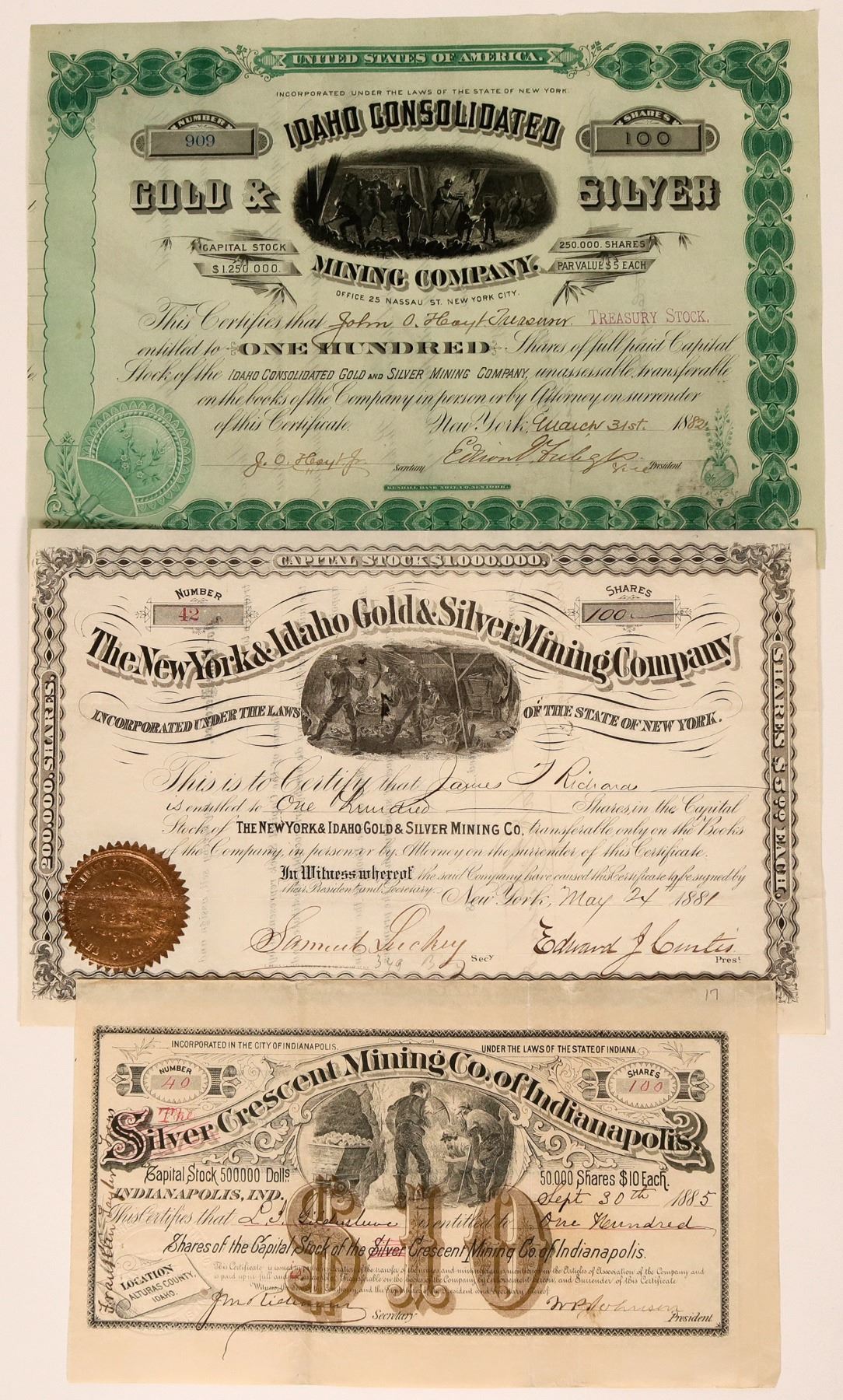 1) Alturas County, Idaho (printed at bottom left). Inc. in Indiana. No. 40, issued for 100 shares in 1885. Signed by president WP Johnson and secretary Jno. Richardson. 2 )Located at Soldier, Idaho, according to The Mining World, Vol. 22. Inc. in New York. No. 909, issued for 100 shares to treasurer John O. Hayt on March 31st, 1882 in New York. Signed by Hayt and the vice-president. 3) Inc. in New York. No. 42, issued for 100 shares to James T. Richards on May 24th, 1881 in NY. Signed by president Edward J. Curtis and secretary Samuel Pickey.