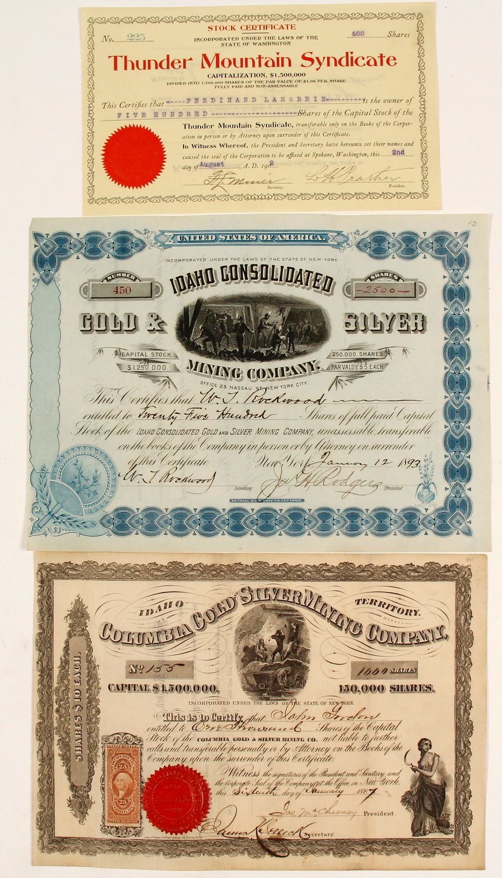 1)Idaho Consolidated Mining #450 i/u to WJ Rockwood 2500 shares, signed by president Rodgers, incorporated in NY 2)Thunder Mountain Syndicate #225 i/u to Ferdinand Langbein 1902 500 shares, signed by president Prarher, incorporated in WA 3)Columbia Gold and SilverMining-Idaho Territory #155 i/u to John Gordon 1867, signed by president McChesney, incorporated in NY State: Idaho Al Adams Collection. HWAC# 58924