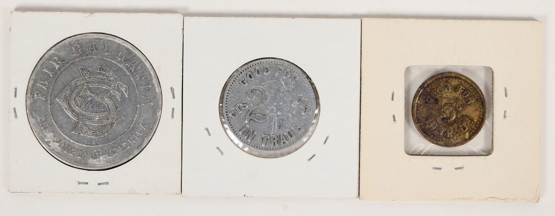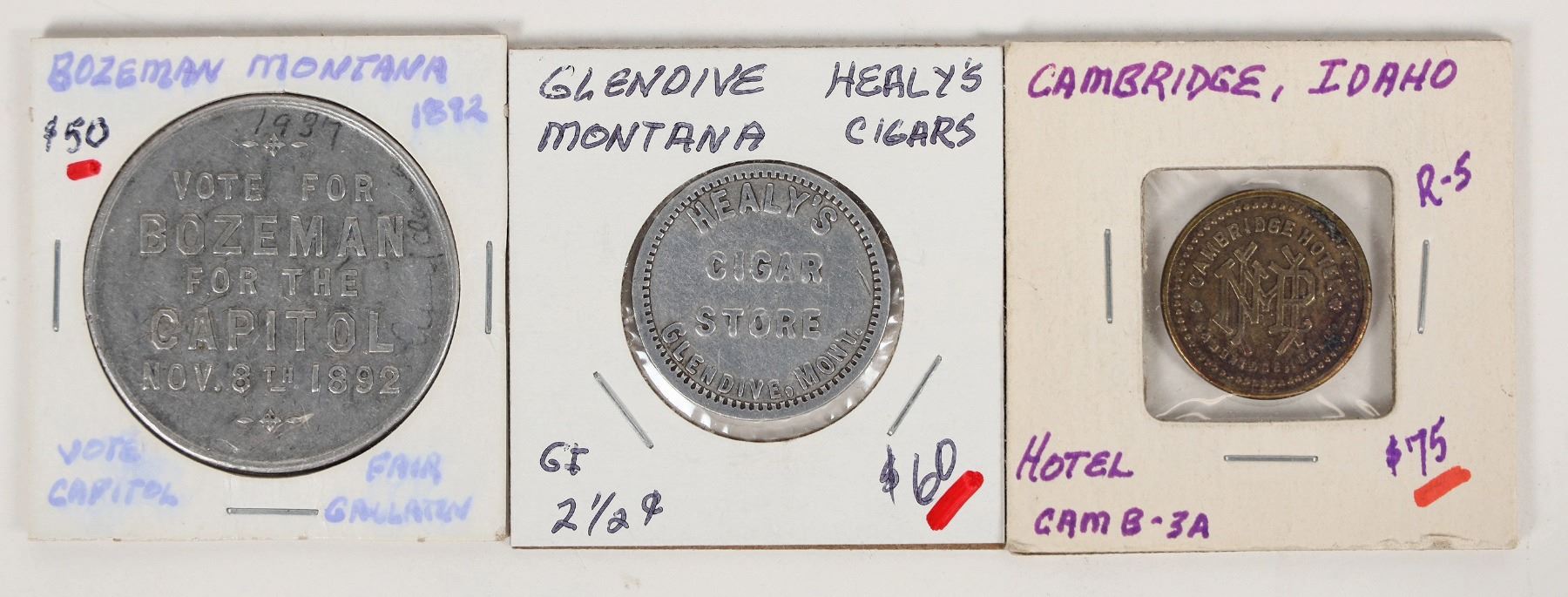 Three tokens: 1) CAMBRIDGE HOTEL / NMP / CAMBRIDGE, IDAHO. // GOOD FOR / 5c / IN TRADE (normal 5c); Br. rd., 21 mm. 2) HEALY'S / CIGAR / STORE / GLENDIVE, MONT. // GOOD FOR / CTS. 25 CTS. / IN TRADE; Al., rd., 26 mm, ("5" is missing). 3) FAIR GALLATIN / THE BCC (monogram) / THE EGYPT OF AMERICA // VOTE FOR / BOZEMAN / FOR THE / CAPITOL / NOV. 8TH 1892; Al., rd., 38 mm.