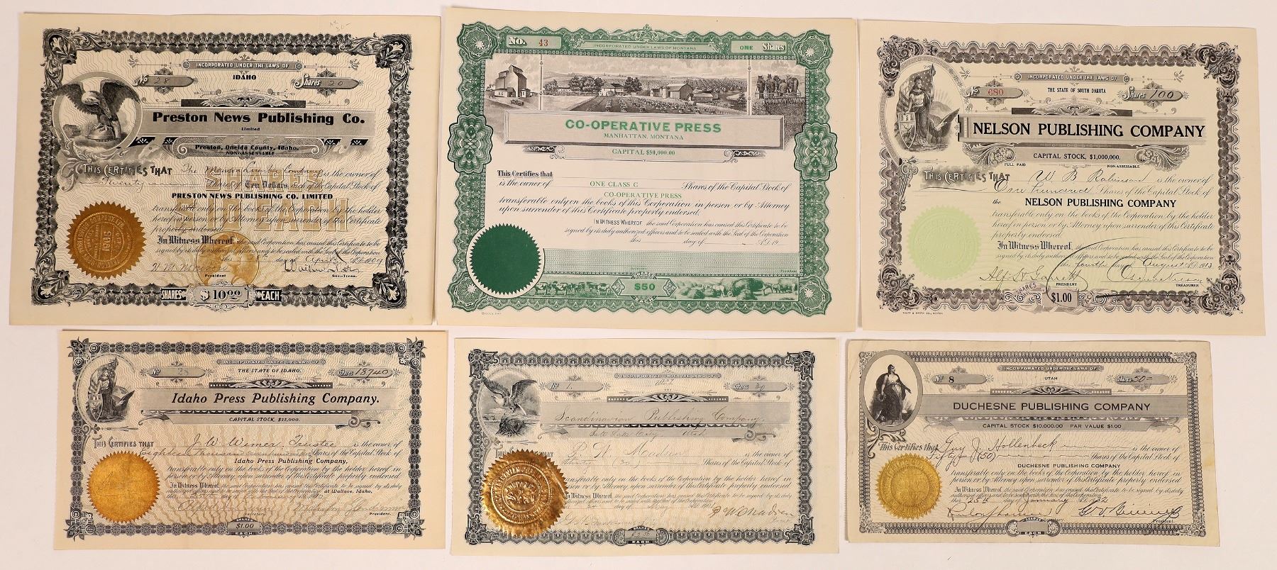 Lot of 6 different. Included: Scandinavian Publishing Co. (stock number 1, Utah, 1901); Duchesne Publishing Co. (Utah, 1932); Nelson Publishing Co. (South Dakota, 1913); Idaho Press Publishing Co. (1910, Wallace); Preston News Publishing Co. (1909, Idaho); and Co-Operative Press (uniss., Manhattan, Montana).