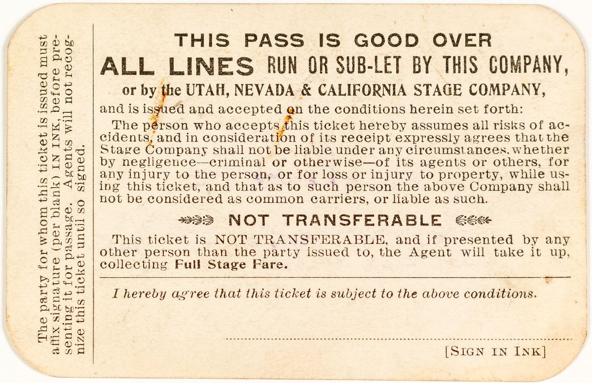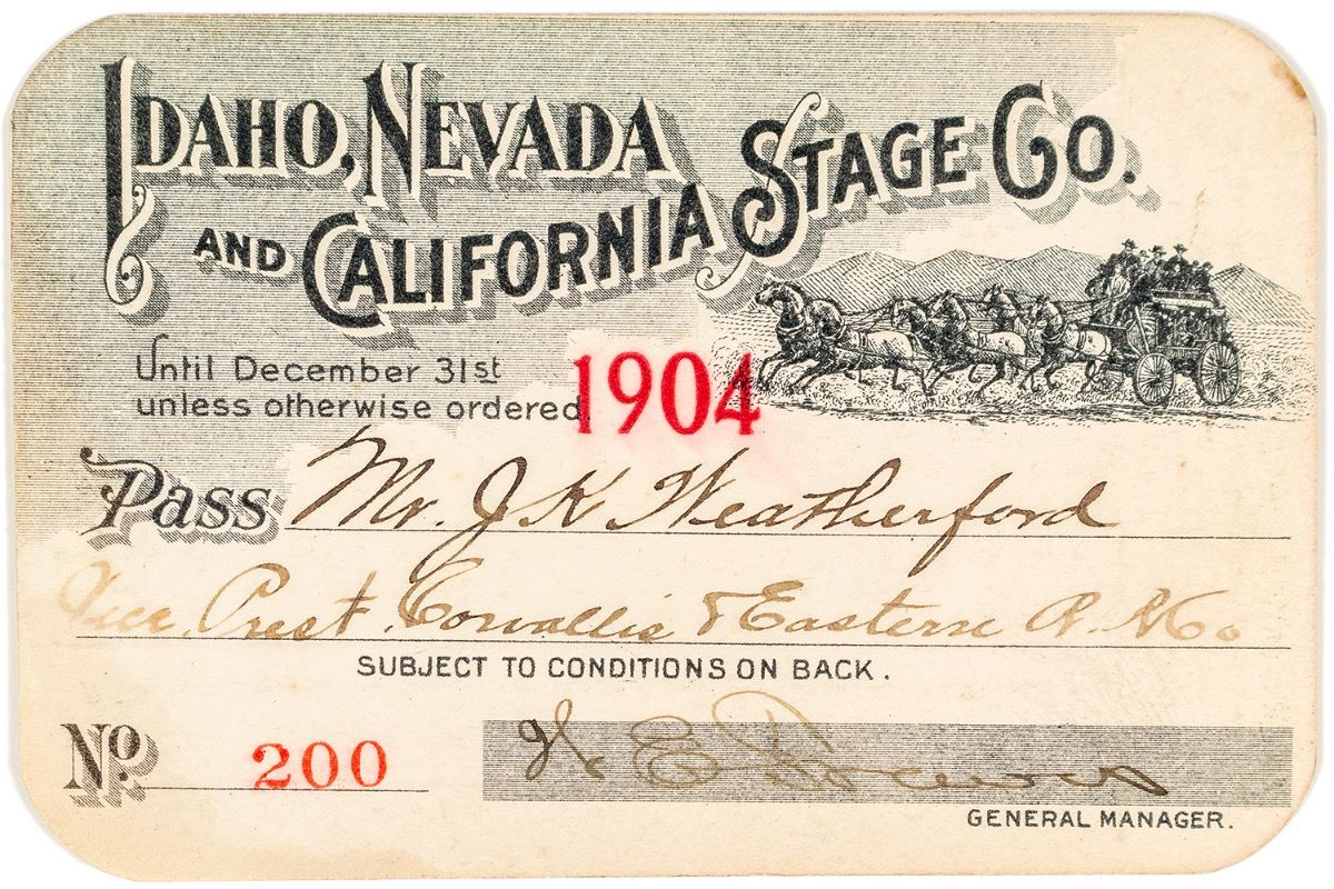 Very attractive and rare Western stage pass. No. 200, issued for 1904 year to J.K. Weatherford, vice president of Corvallis & Eastern Railroad Company. Signed by W.E. Travis as general manager. Fabulous vignette in upper right of stagecoach. Reverse states it is also good on Utah, Nevada & California Stage Company lines. Printed on cardstock. Soiling. According to an 1899 advertisement in the Lewiston Tribune, the company offered "daily service from Lewiston to Grangeville and intermediate points, making close connections at Grangeville for the Buffalo Hump Mining District. This line affords a daily service to all the following points: Buffalo Hump, via Florence, Slate Creek, Adams Camp, Mt. Idaho and Grangeville: Buffalo Hump via Badger, Elk City, Bridgeport, Grangeville, Denver, Cottonwood, Westlake, Morrow and Waha Lake. C. F. Leland, General Agent, Lewiston. Six-horse stock, seventeen passenger coaches, Buffalo to Lewiston in 36 hours, all daylight travel. First class eating stations. W. E. Travis, General Manager, Salt Lake City, Utah." (Prag Collection) City: State: Idaho Date: Inventory# 39109