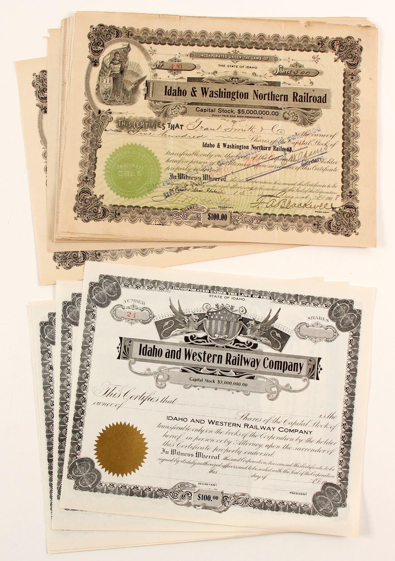 23 certificates. 18 Idaho & Washington Northern Railroad, 9 issued/cancelled, 9 unissued, Nicely engraved black border, green embossed corp seal, green circle underprint, vignette allegorical female holding American flag right hand and a shield w/elk/trees left hand eagle spread wing, fair to excellent condition. Shaw and Borden Co printer . 5 unissued Idaho and Western Railway Co., black border, vignette union shield w/griffons on each side, AU condition, no identified printer. Idaho