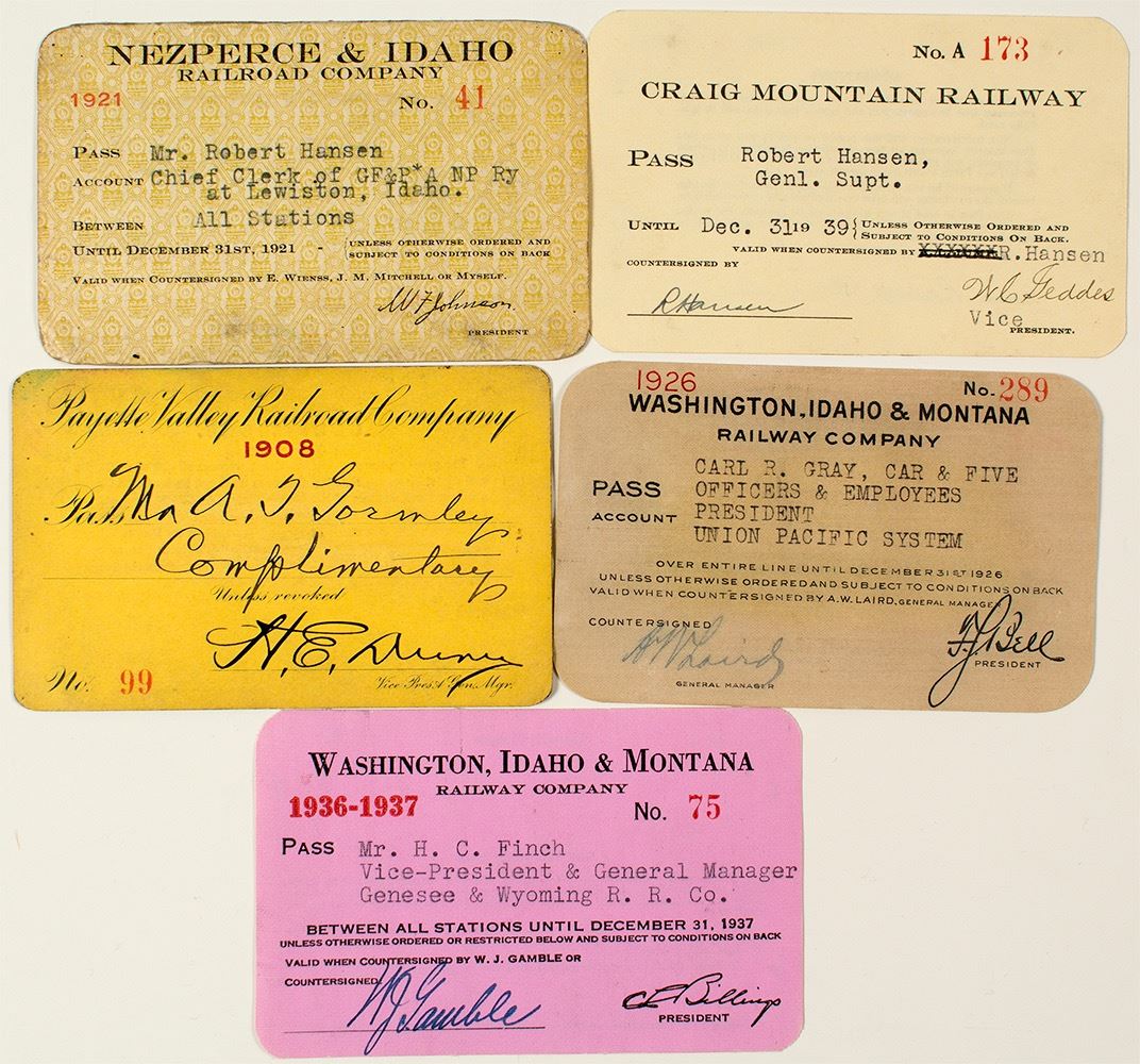 Lot of 5 from 4 different rails operating in Idaho. Included: Payette Valley Railroad Co. issued 1908; Craig Mountain Railway issued 1939; Nezperce & Idaho Railroad Co. issued 1921; and Washington, Idaho & Montana Railway Co. issued 1926 and 1936-37. Please inspect. (Prag Collection) City: State: Idaho Date: Inventory# 39405