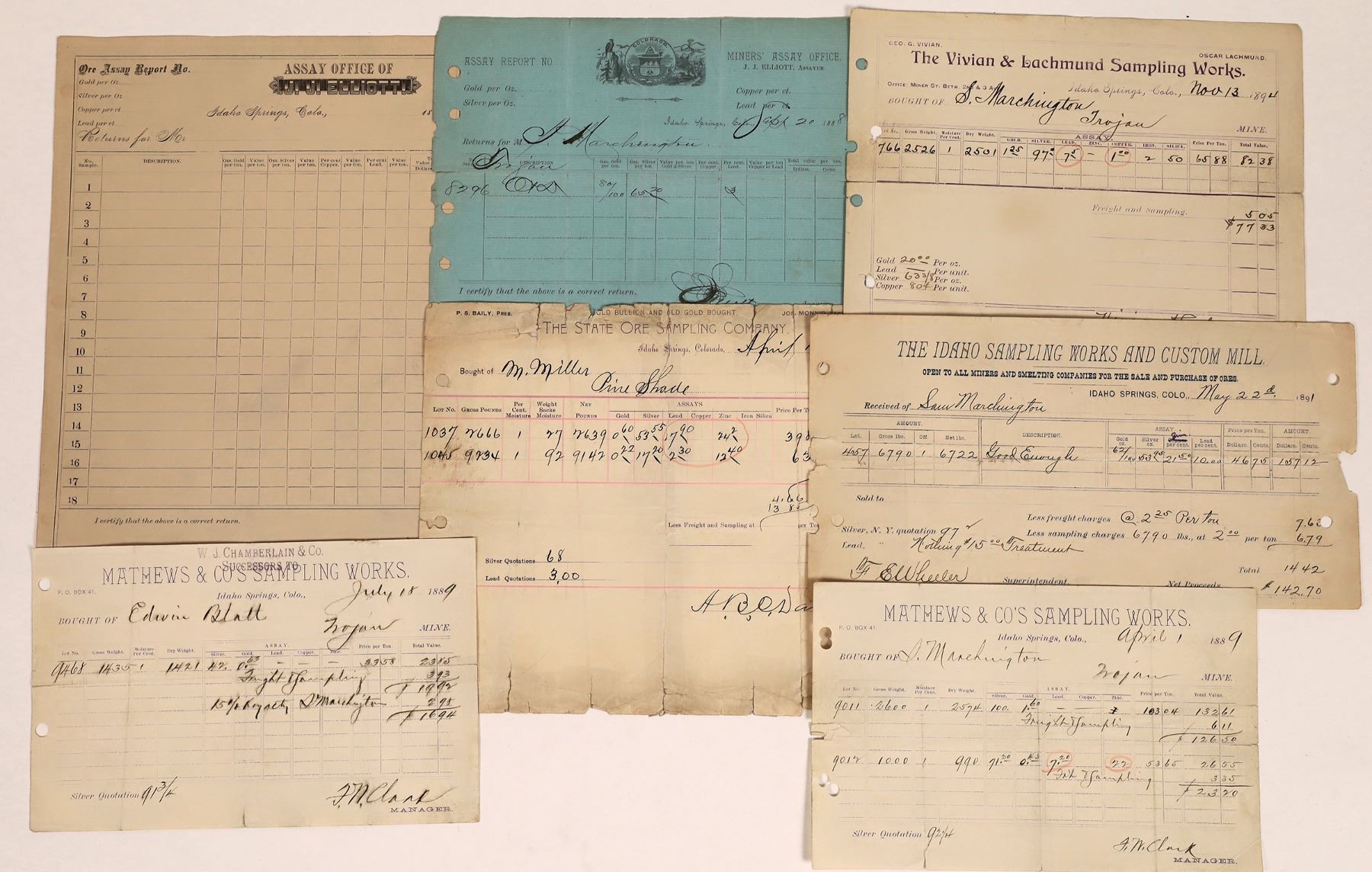 Lot of 7. 1) J. J. Elliott Assay report with 18 lines. Although this is unused, it might be the most interesting for rarity. 1880s. 2) JJ Elliott blue assay report. 1888. Trojan Claim. 3) State Ore Sampling Company. 1896. For the pine Shade Mine. Gold, silver, lead and zinc. PS Bailey president. 4) Vivian & Lachmund Sampling Works. 1894 for the Trojan Mine. Ores include gold, silver, lead, copper, iron & silica. 5) Idaho Sampling Works and Custom Mill. 1891. For Sam Marchington. FE Wheeler superintendent. Take home $142.70. 6) Mathews & Co's Sampling Works. For the Trojan Mine. 1889. Take home a whopping $23.20. 7) WJ Chamberlain &Co. (stamped over Mathews & Co's Sampling Works). For the Trojan Mine. FN Clark manager. Many of these samples are very rough. Idaho Springs, Clear Creek County Colorado Franklin Collection