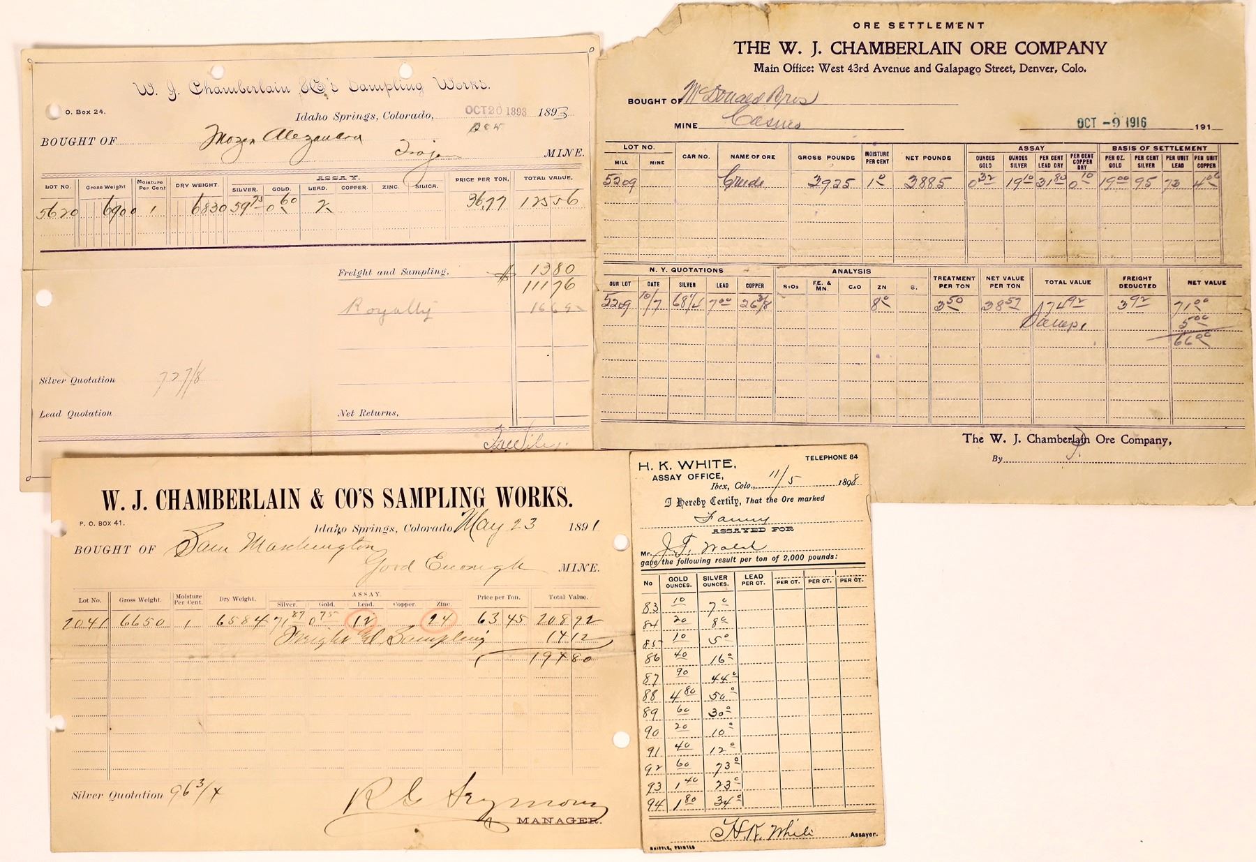Lot of 4. 1-3) W.J. Chamberlain. 1891 value $194.80 to Sam Washington for the Good Enough Mine. 1893 value $111.76 to Alexander for the Trojan Mine. And 1916 for $66 to McDonald Brothers for the Cas--- Mine. 4) Assay card for HK White. 1898, Twelve samples from 5c to 73c to FJ Wald. Rare. Idaho Springs, Clear Creek County Colorado