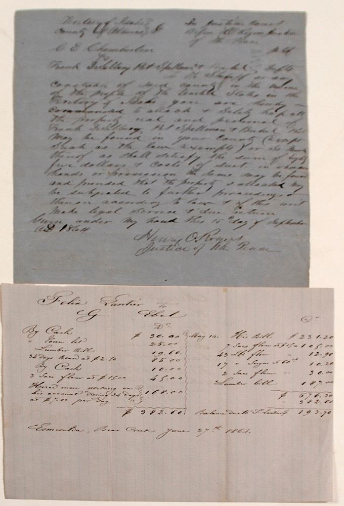 Blue paper letter dated Sept. 15, 1864 from Justice of the Peace Alturas County regarding property. June 27, 1864 billhead. Date: 1864 Location: Alturas County, Idaho HWAC# 57243