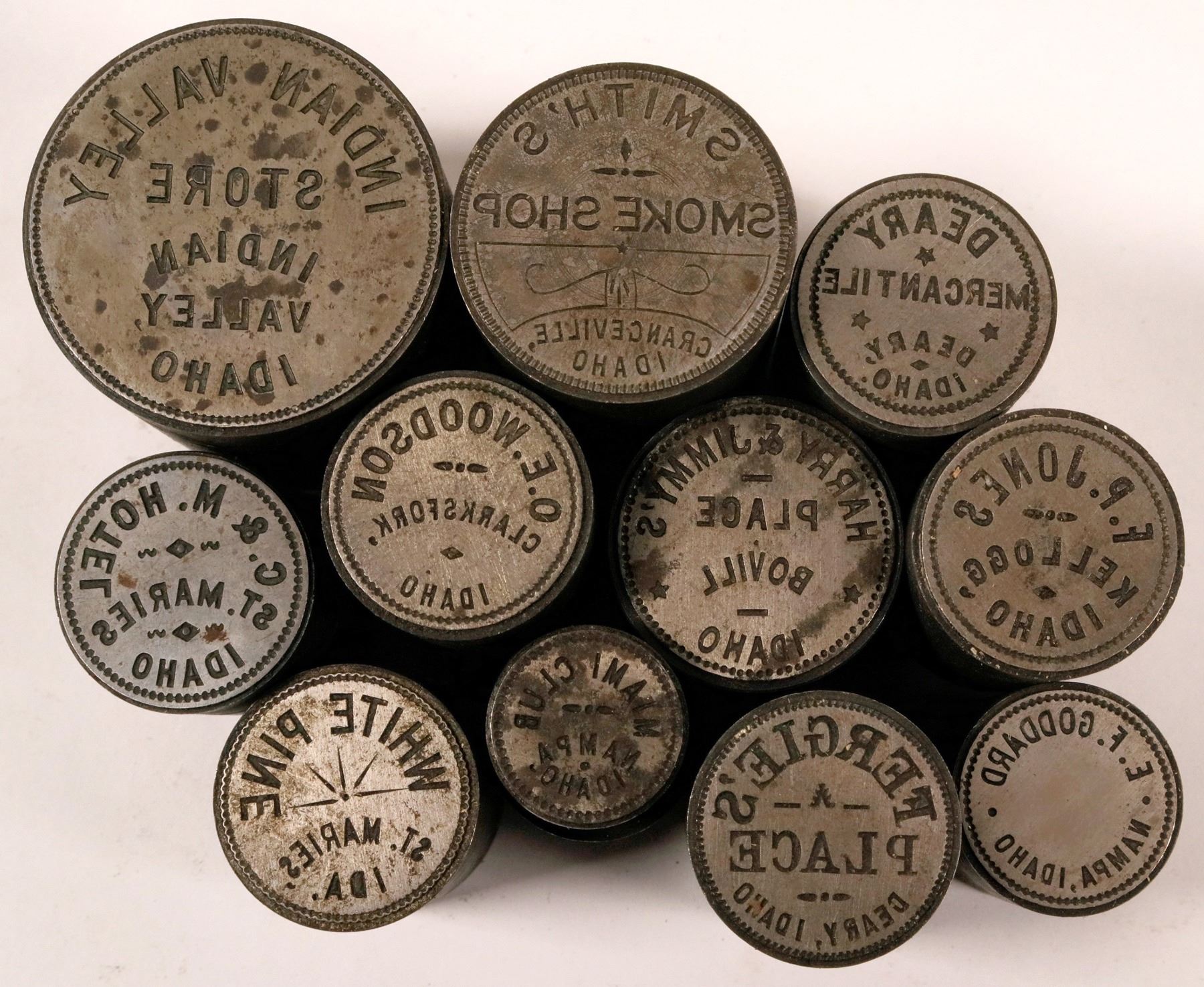 A set of eleven, self-identified round token dies ranging in diameter from 5/8 to 1-7/16-inch. Examples include the Indian Valley Store from Indian Valley, Idaho; O.E. Woodon from Clarksfork, Idaho; Fergie's Place and Deary Mercantile from Deary, Idaho; C&M Hotel in St. Maries, Idaho; Smith's Smoke Shop in Chanceville, Idaho; and more. Use them in groups as unique decor or individually as paperweights. These were made by a Seattle-area die cutter in the mid-twentieth century and are now available as collectibles.
