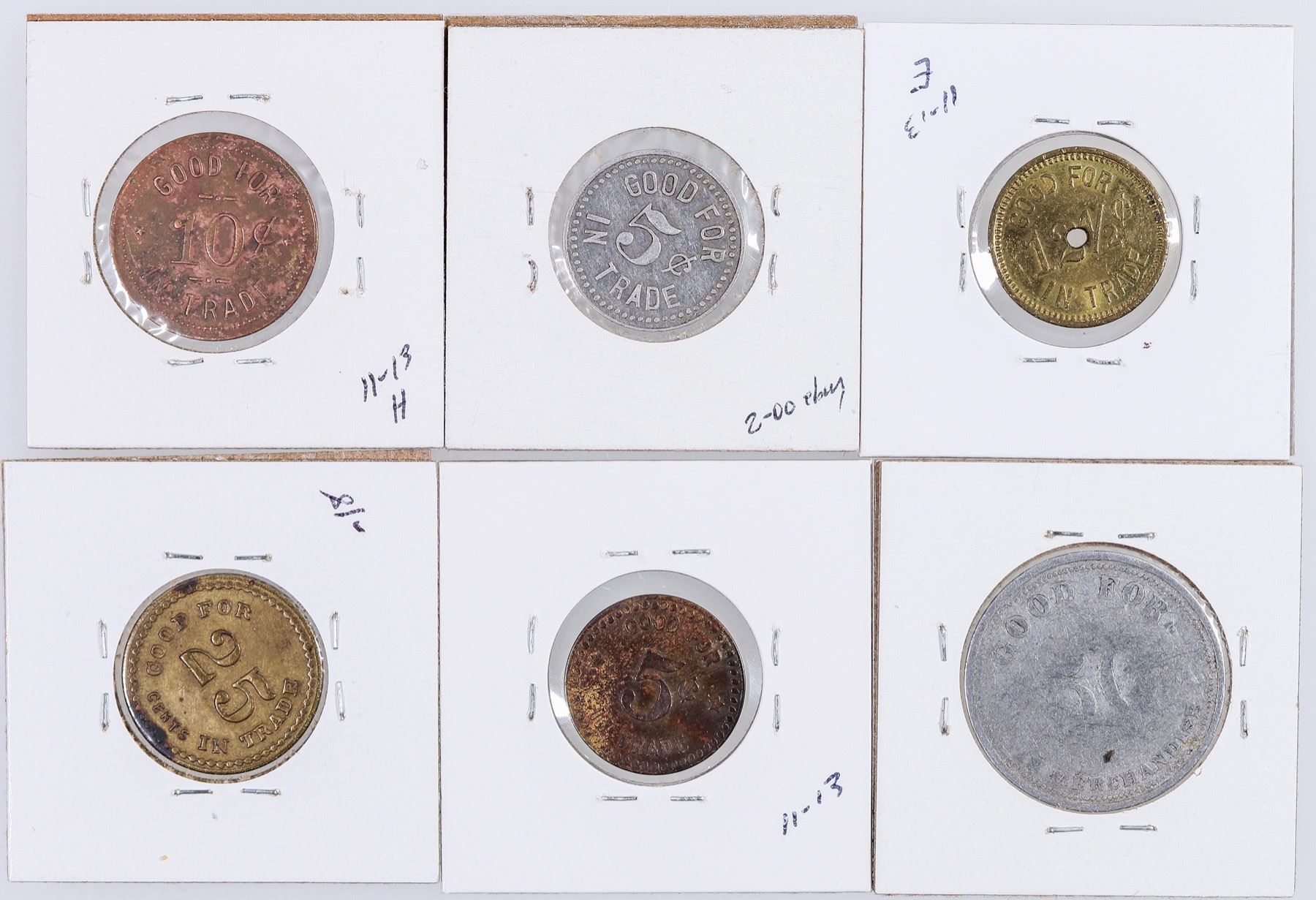 Lot of six tokens from Idaho: Orofino: Alaska Bar; Pocatello: The Senate; Moscow: Badger Store; Coeur D'Alene: Idaho Cigar Store; Boise: Bouquet Cigar Store; Boise: Exchange Cigar Store.