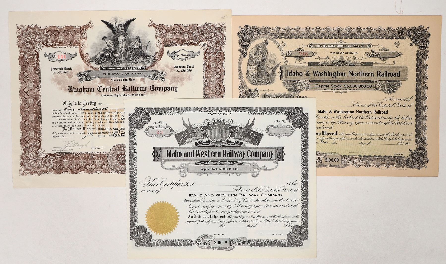 Group of 3 stock certificates, dating from the early 1900s, from three Idaho or Utah-based railroad companies: the Idaho & Western Railway Company, Idaho & Washington Northern railroad, and Bingham Central Railway Company. The Bingham certificate is issued and uncancelled; the others are unissued. All are in good condition.