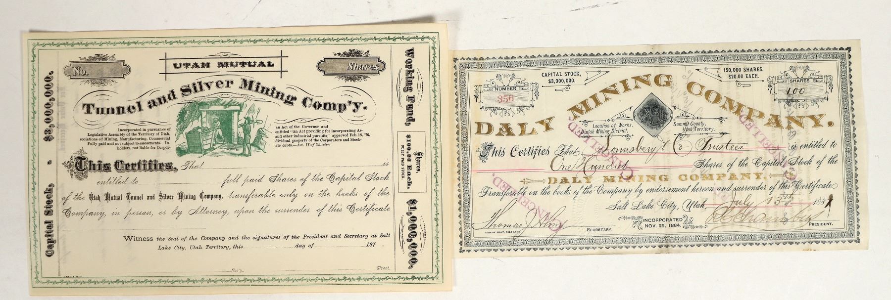 Lot of 3. U/U, I/U, I/C. Issued 1881-82. Tunnel and Silver Mining Co. , Columbia and Brauer Silver Mining Co. and Daly Mining Co.. VG plus cond. Printers Dennison & Brown Tribune Print,