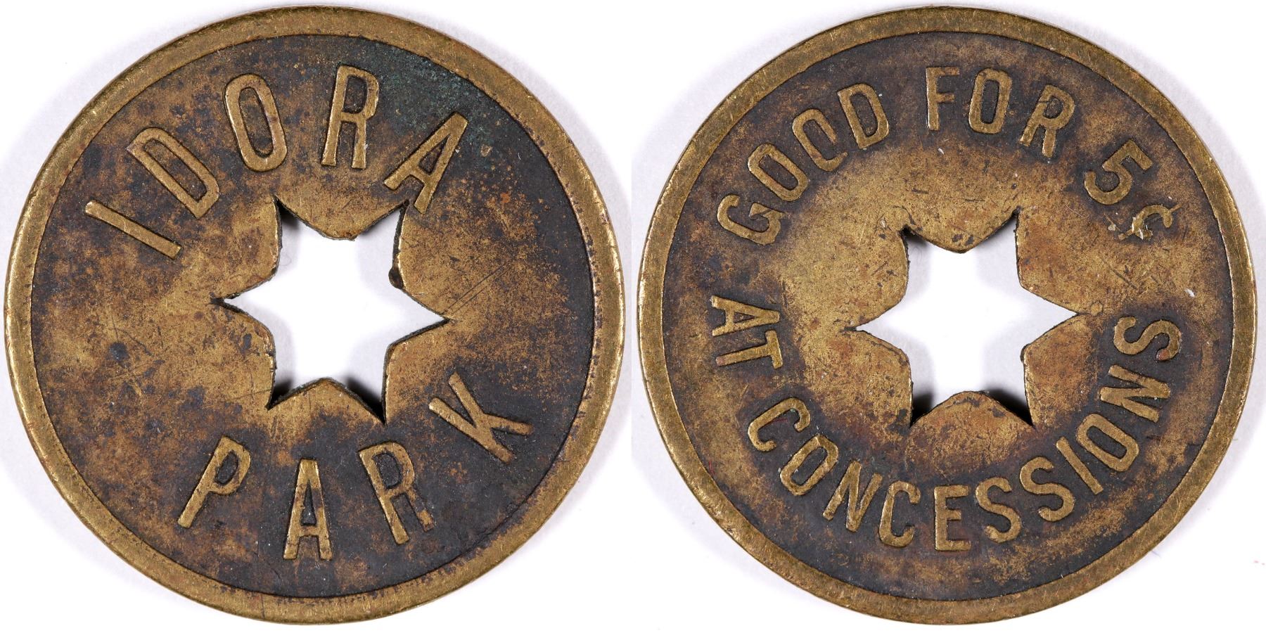 IDORA / PARK // GOOD FOR 5¢ / AT CONCESSIONS (star cutout); Br. rd., 21 mm. Ex Ron Lerch collection. Idora Park was a Victorian era trolley park in north Oakland, California constructed in 1904 on the site of an informal park setting called Ayala Park on the north banks of Temescal Creek.