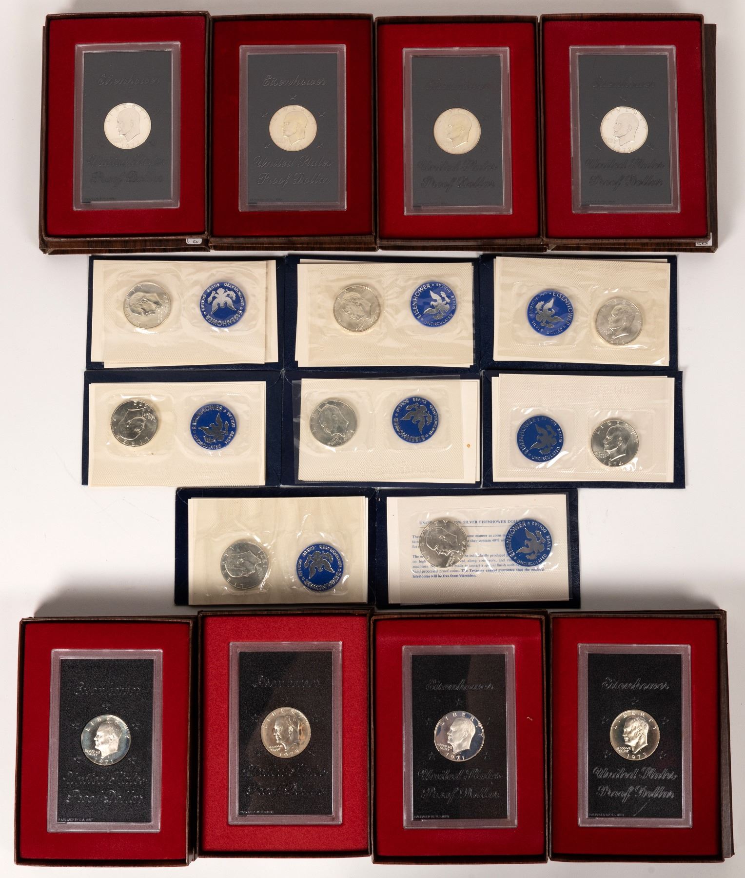 Lot of 16 Proof and Uncirculated Eisenhower dollars. Four each from 1971, 1972, 1973 & 1974.