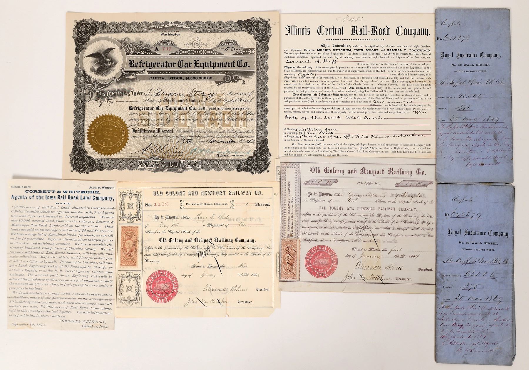 Railroad ephemera from the Illinois Central (Land promotion document), Buffalo & Erie (Two Insurance policies), Iowa Rail Road (Land promotion document) and Old Colony & Newport Railway (Two stock certs). As a little bonus, there is a stock cert for The Refrigerator Car Equipment Company for 50 shares at $100 per. A nice look at early railroads. Please see photos for more details. Illinois 1800s