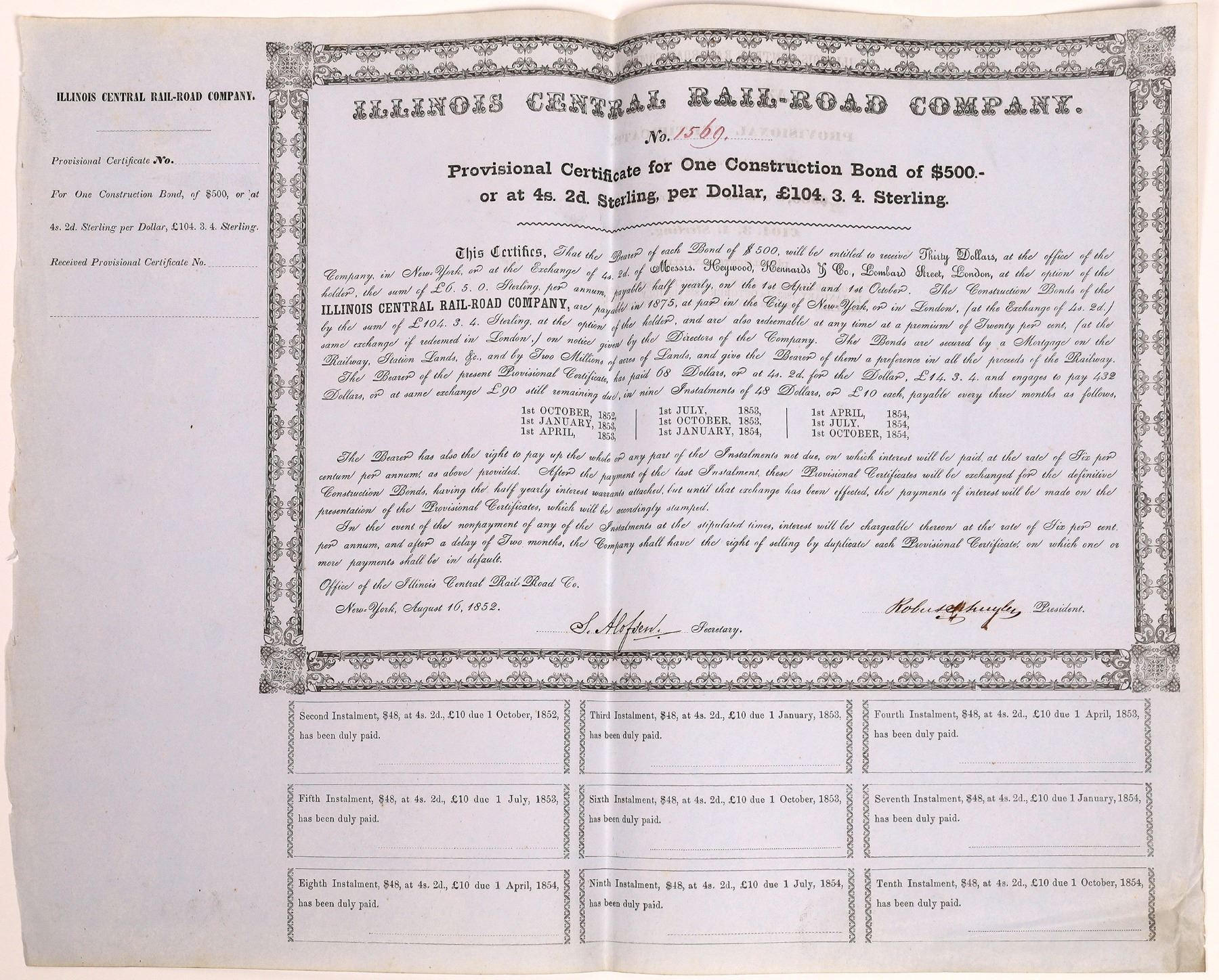 Signed by president Robert Schuler. He is often referred to as America's first Railroad King. He also was part of American's first stock fraud in 1854 as part of the New York and New Haven Railroad. He would flee America and in 1855 die in France. [wikipedia]. The Illinois Central Railroad, sometimes called the Main Line of Mid-America, was a railroad in the central United States, with its primary routes connecting Chicago, Illinois, with New Orleans, Louisiana, and Mobile, Alabama in the 1850Ãs. In 1998 the Canadian National Railway acquired control of this line. #1569. All installment coupons are attached. Edge wear and folds. Otherwise in very nice condition. Illinois 1852