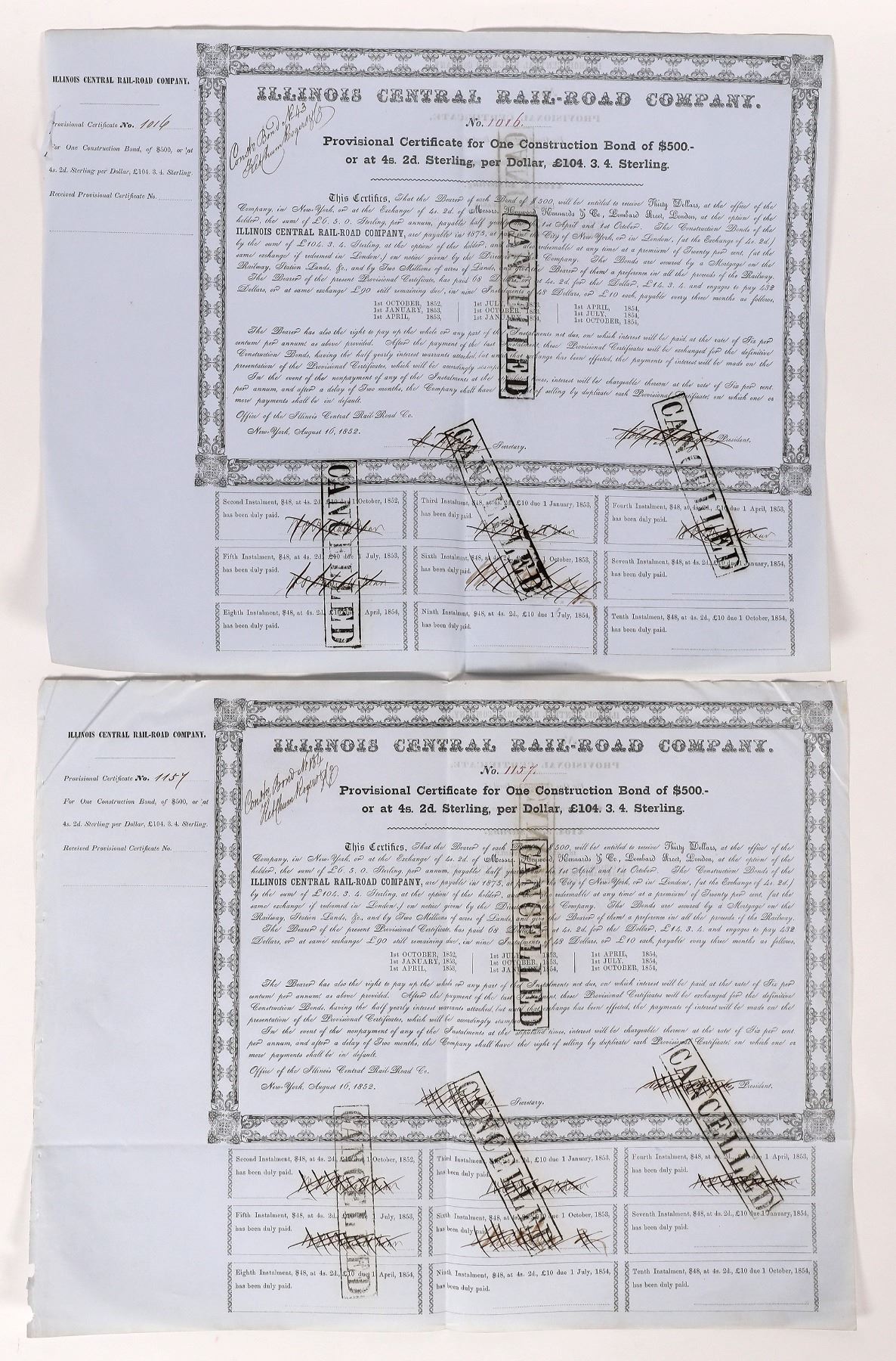 2 i/c 1852 Illinois Central Railroad bonds. $500, Sterling per dollar. Illinois Ken Prag Collection