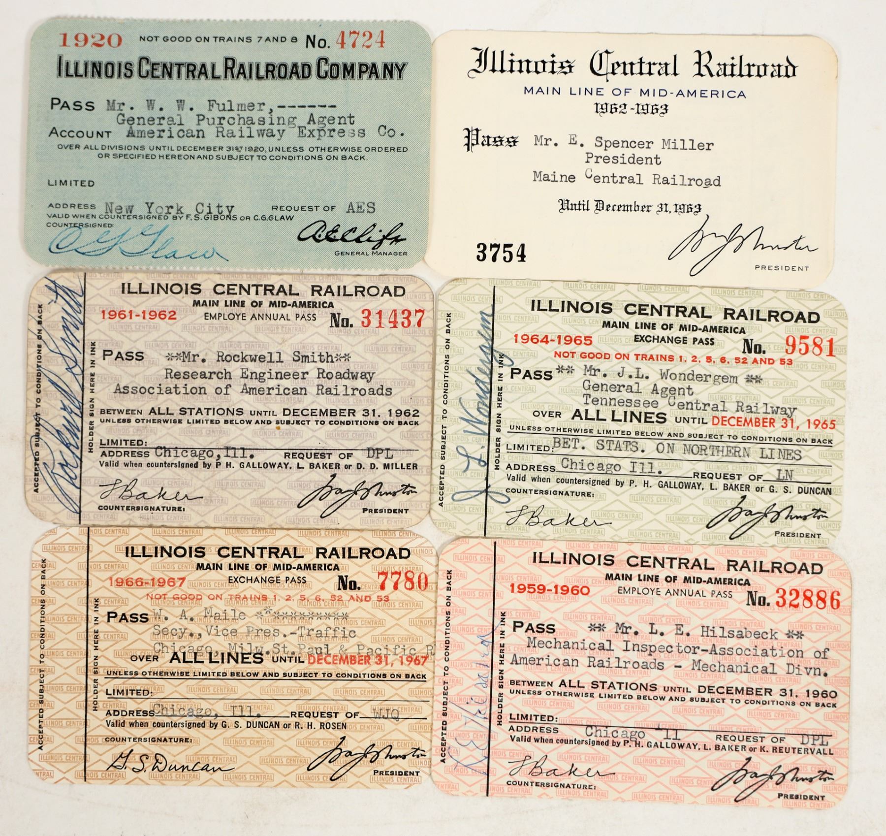 Group of 6 railroad passes from the Illinois Central Railroad Company. Passes date from the early 1900s; see photos for specific years and additional detail.