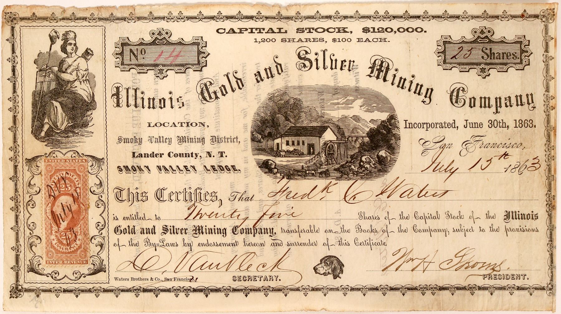 Rare Smoky Valley Ledge, Smoky Valley Mining District, Lander County, N.T. Incorporated June 30th, 1863. Dateline San Francisco, August 5th, 1863. No. 28, issued for 5 shares to Frederick C Waters. (interestingly Frederick C Waters was one of the Waters Brothers printers!) Signed by the president Wm. H. Stevens, and secretary, D. VanVleck. VanVleck is listed as a wood engraver at 611 Clay Street.Not cancelled. 25c Insurance revenue stamp. Three vignettes: mine with paddlewheel (top center), allegorical woman (left) and dog head (bottom). Printed by Waters Brothers & Co., SF. Edges are rough and there is some staining around the edges. Not in Filer. Listed in the 1863 Langley SF directory with an office at 611 Clay Street. A May 30th, 1863 Reese River Reveille article details a meeting about amending the laws of the district. The boundaries of the district were set as follows: "On the west side by the dividing ridge between the waters of Smoky Valley and Reese River Valley; on the north by the Overland Stage road; on the east by Smoky Valley; on the south by a distance of ten miles from Birch Creek." Ken Prag Collection
