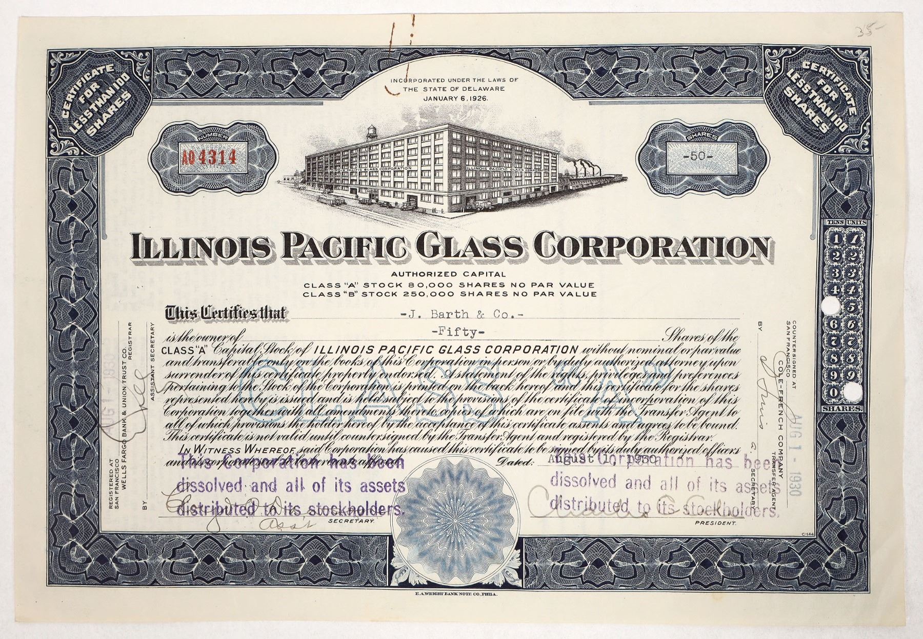 A stock certificate for 50 shares in the Illinois Pacific Glass Corporation, made out to J. Barth & Co. in 1930. No. 4314 issued. The certificate is signed by the company's secretary and president, and bears a faint embossed seal. The signatures have been obscured with a stamp declaring that the company has been dissolved and its assets distributed. Nice vignette of building in 2-point perspective. Rust mark from old paperclip; otherwise great condition.