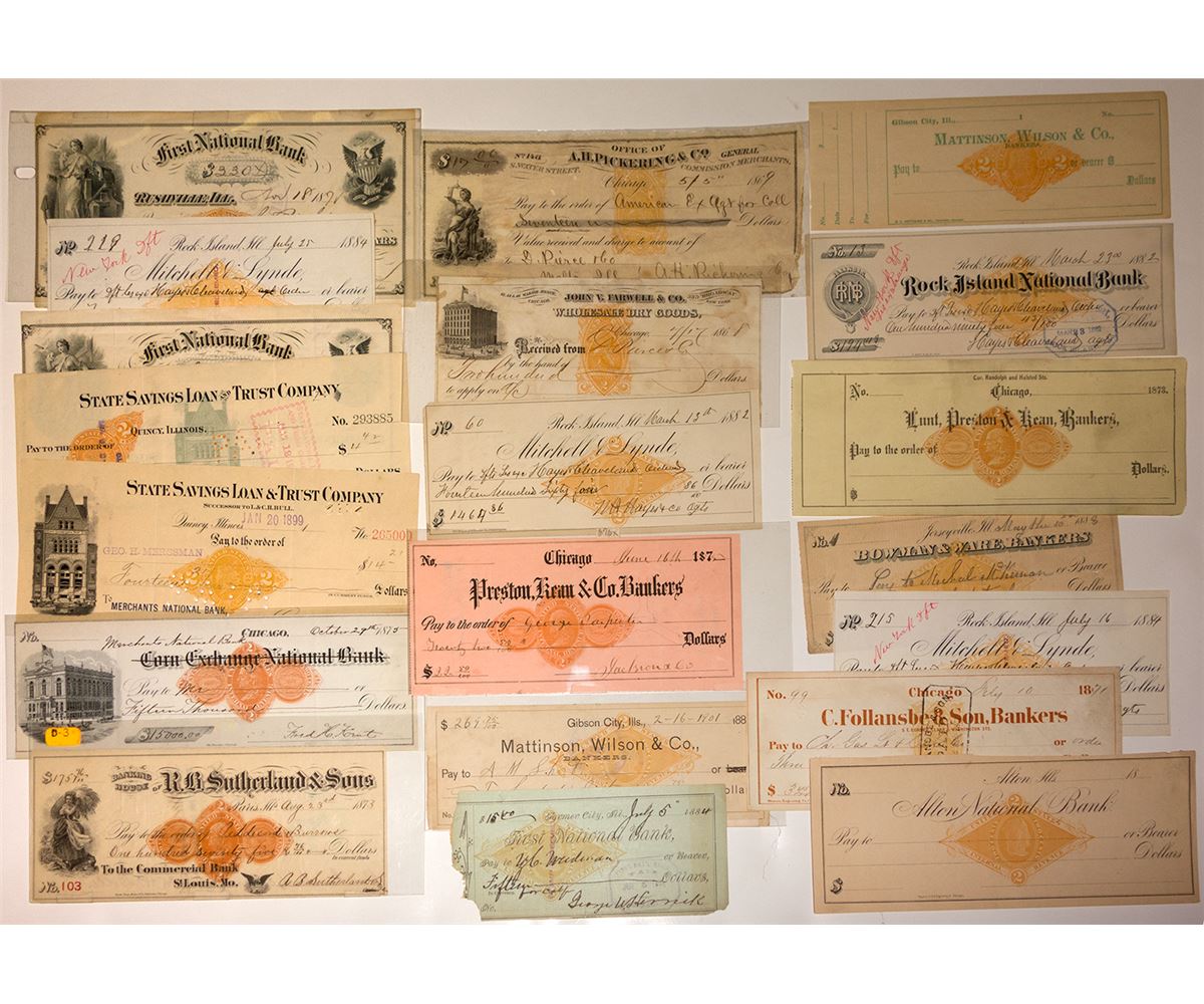 Lot of 20 checks from Alton, Rushville, Quincy, Rock Island, Chicago, Paris, Farmer City, Gibson City, and Jerseyville banks dated 1868 through 1899. Revenue stamps represented include: 3 RNB, 4 RND, 2 RNF, 8 RNG, 3 RNX.