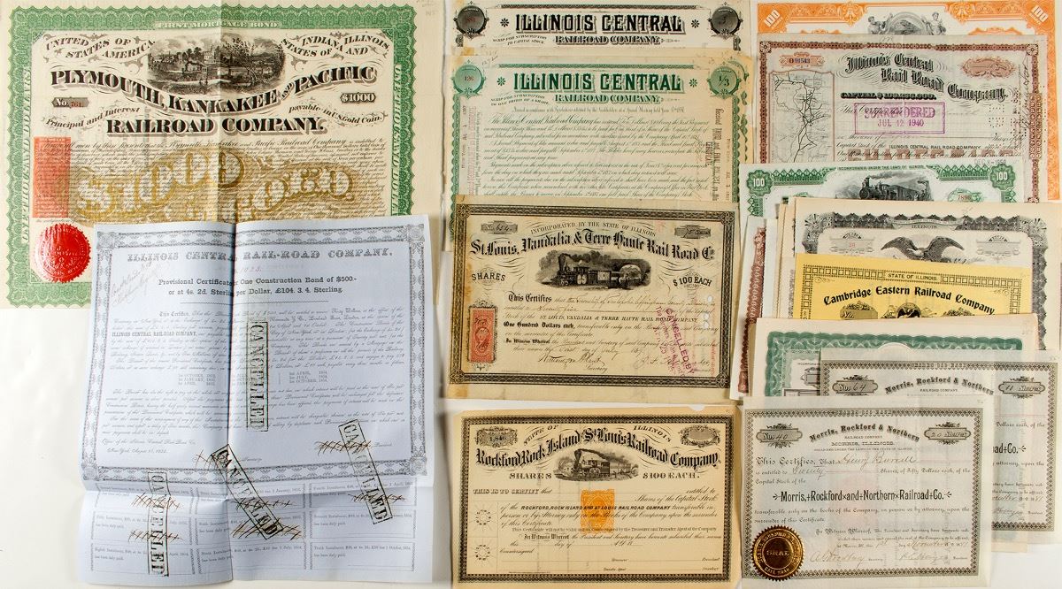Lot of 25. Highlights: $1,000 bond for Plymouth, Kankakee and Pacific Railroad Company with RN-W2 revenue imprint, 1871, punch cancelled; early 1852 bond for Illinois Central Rail-Road Company, pen and stamp cancelled, blue paper; Rockford, Rock Island and St. Louis Railroad Co. stock with RN-T4 revenue imprint, unissued; St. Louis, Vandalia & Terre Haute Rail Road Co. stock issued 1869 with adhesive 25c revenue stamp; three issued scrip stocks for Illinois Central (1887) plus two other different stocks (1919 & 1962); pair of stocks for Morris, Rockford and Northern Rail Road Co. (both 1881); pair of different stocks for The Peoria and Eastern Railway (both 1950); and fourteen unissued including early pieces. Please inspect. (Prag Collection) City: State: Illinois Date: 1852-1962 hwac# 33970
