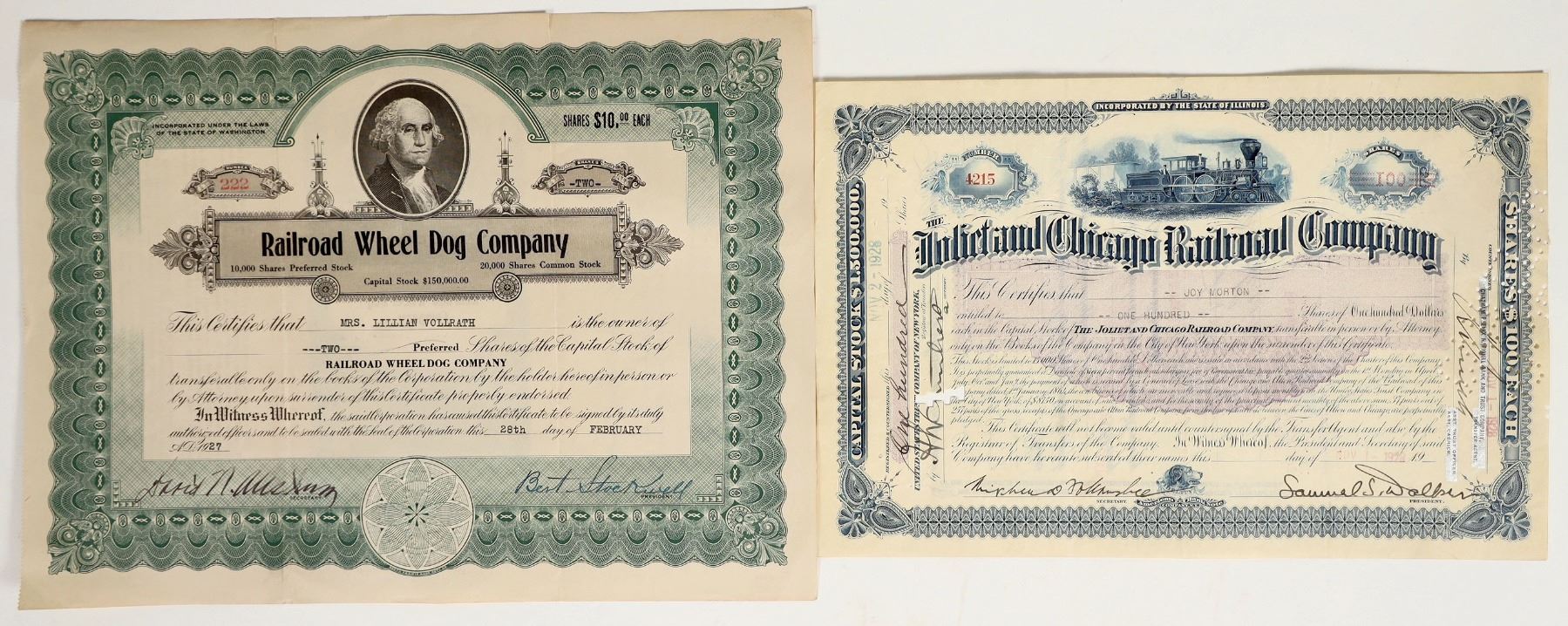 Lot of 2. I/U. Issued 1927-28. Railroad Wheel Dog Co. ( great title) and The Joliet and Chicago Railroad Co.. EF cond. Printers : American BNC and North Pacific BNC. Both are in protective covers and come with background research on each.