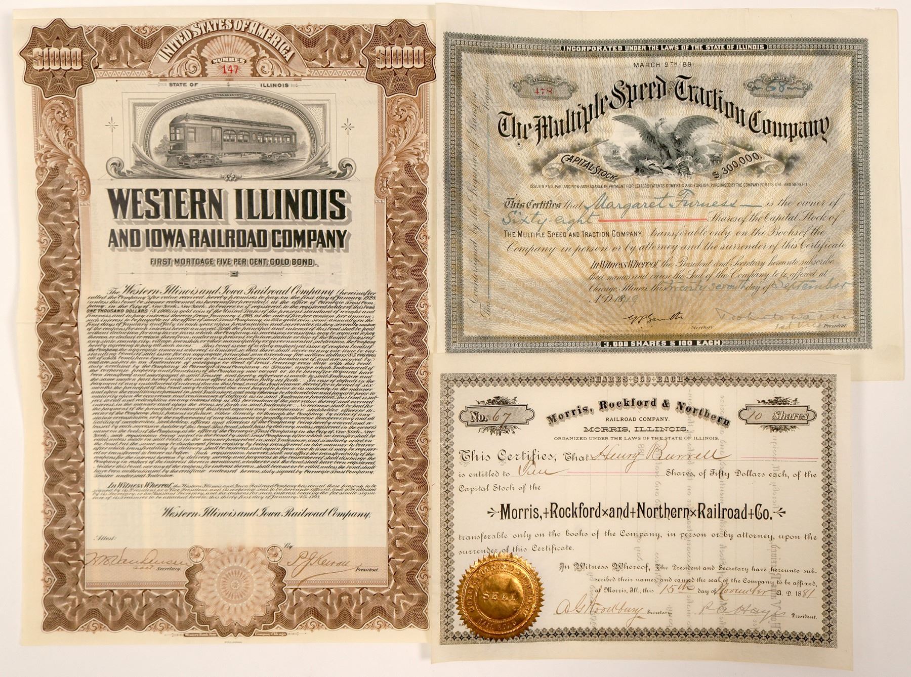 #67, I/U, 10 shares common stock @ $50 par, issued Nov. 15, 1881, singed RBT Hayes President, BLCK, gold embossed seal, no vignette, arched title, light tri-fold. VF