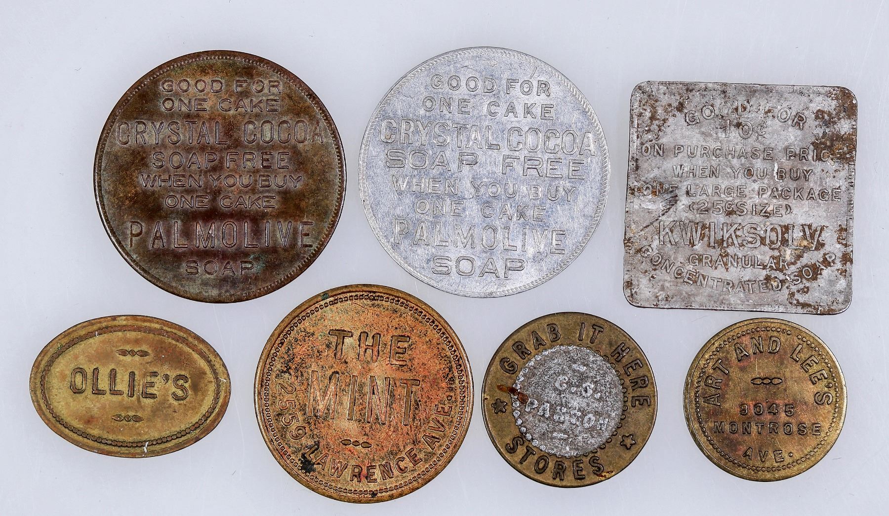Lot of seven tokens from Illinois: Palmolive-Peet Co., Chicago (2); Grab It Here Stores, Danville (bimetallic); Ollie's (oval); Art and Lee's, Chicago; The Mint, Chicago; Kwilsolv Granular Concentrated Soap, Chicago.