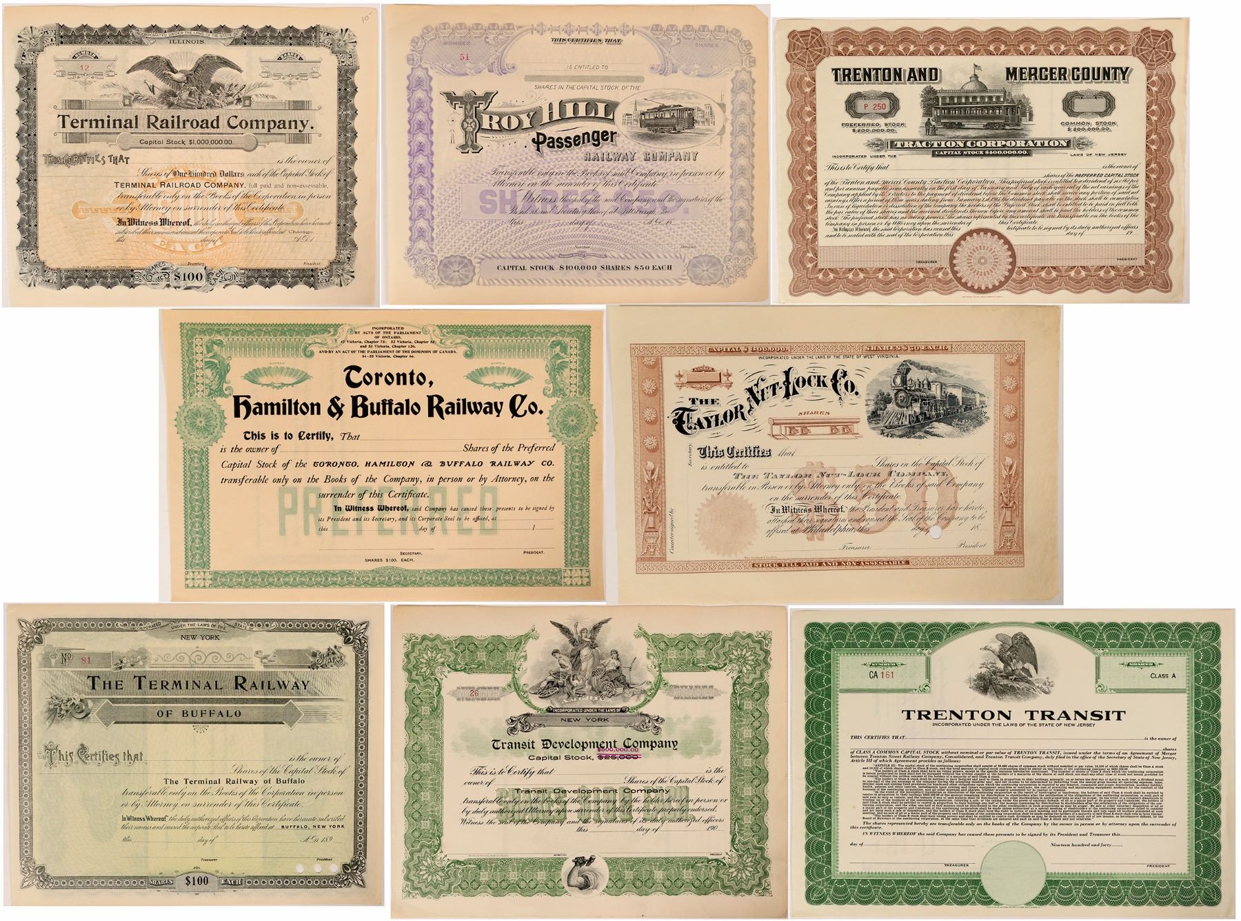 8 certificates. All are are unissued/ cancelled except for one cancelled. Datelines are 1___, 18___ and 19__. Green. black, brown. and blue. Example: Toronto, Hamilton & Buffalo Railway Co. Franklin Bank note co. Troy Hill Passenger Railway . The Taylor Nut-Lock Co. Theo Leonhardt & Son printer. Terminal Railroad Co. S.D. Childs & Co printer. Trenton Transit Security Bank Note Co printer.