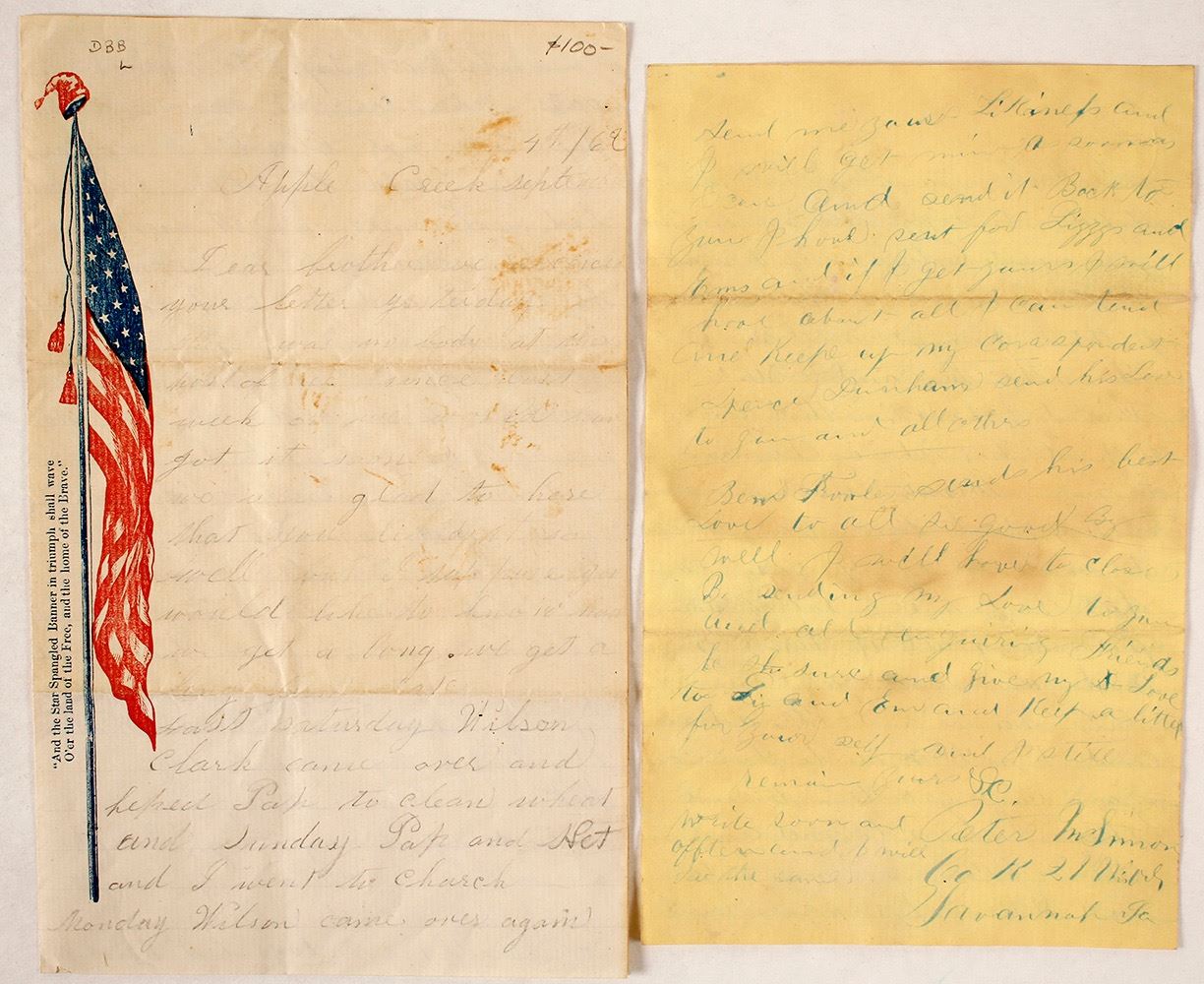 1) Patriotic Civil War Letter sheet with large American flag and quote on "And the Star Spangled Banner in triumph shall wave o'er the land of the Free and the home of the Brave." Written from Apple Creek. Beginning of letter is very faded over the years. Farming news. 2) Camped 30 miles from Savannah near Sisters Ferry on the Savannah River. News of camp "a lot of old clothes hung up to dry""have got a nice piece of ground". Water stained and hard to read. (Potter Collection) Date: 1864 Location: HWAC# 59467