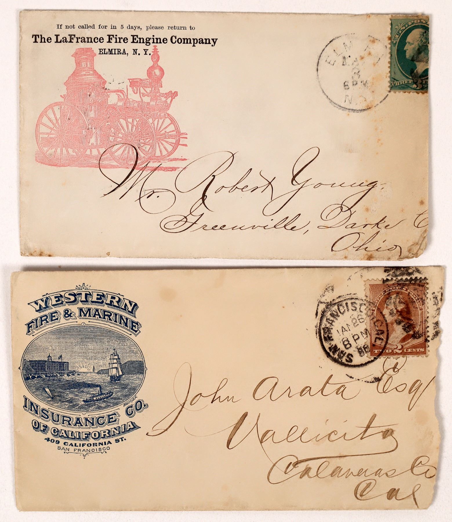 Lot of 2 different. No contents. 1) The LaFrance Fire Engine Company, Elmira, New York. Pre-1900. Color vignette of early fire engine. 2) Western Fire & Marine Insurance Co. of California, San Francisco. Mailed 1888 to Vallicito, Calaveras County, California. Vignette of San Francisco Bay.