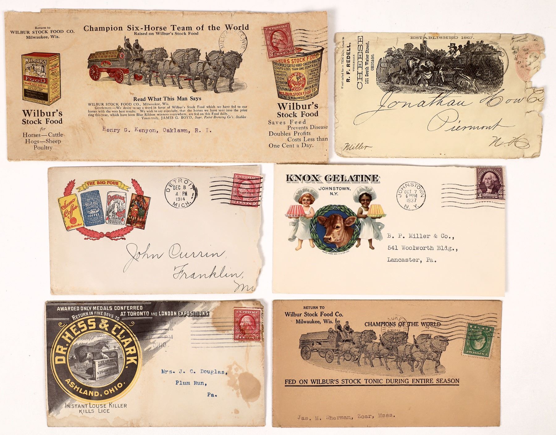 Lot of 6 different, all pictorial. Includes: Dr. Hess & Clark (Ashland, Ohio, 1914); Big Four Coffee (Detroit, 1914); Wilbur Stock Food Co. (two different, Milwaukee, 1912); RF Redell (Chicago, pre-1900); and Knox Gelatine (Johnstown, 1937).