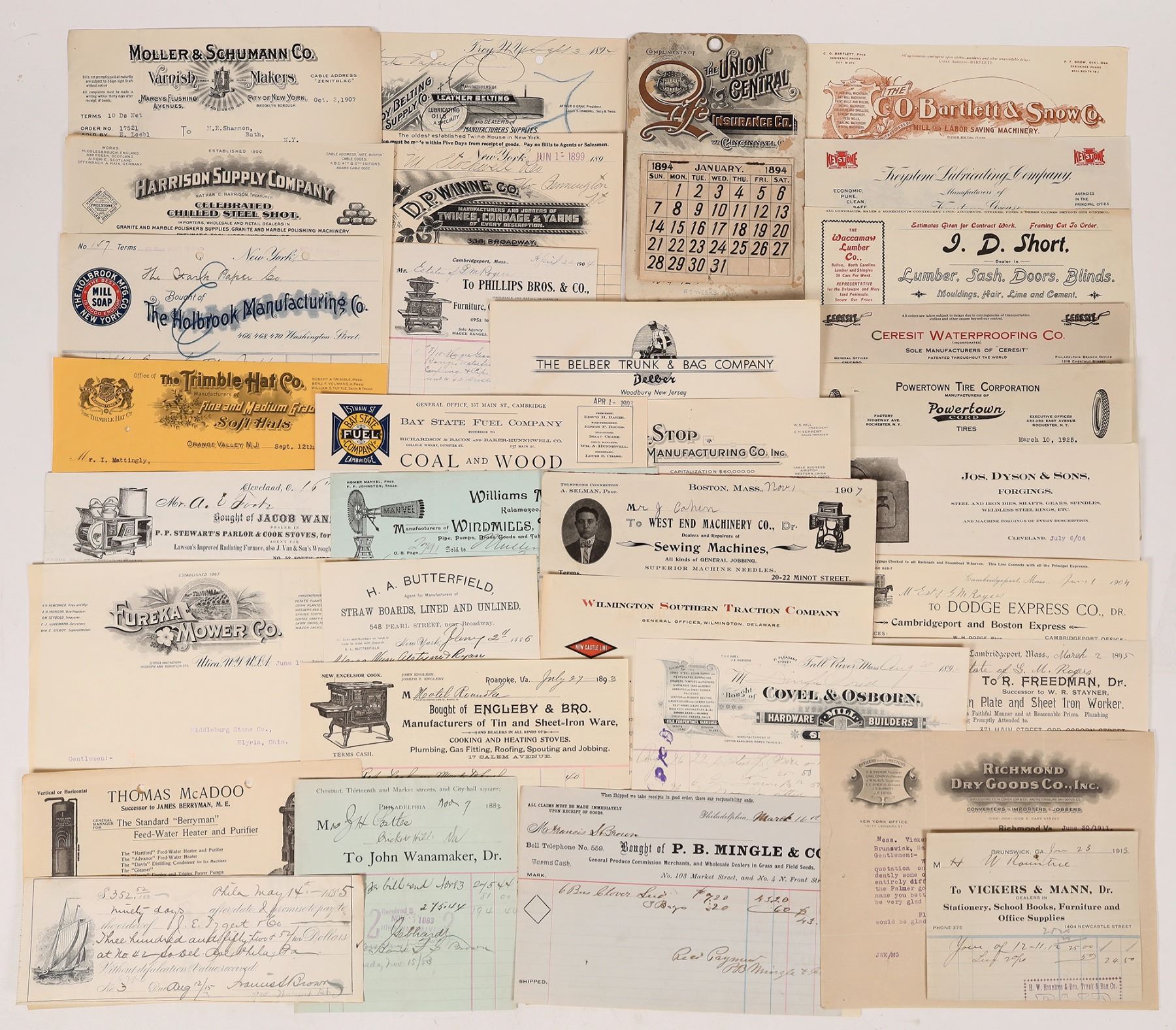 Ephemera from the late 1800s and early 1900s. Union Central Life Insurance Co. of Cincinnati 1894 wall calendar. Letterheads from all over the country: New York, Massachusetts, Cleveland, Iowa, Pennsylvania, Virginia, New Jersey and others. About 40 pieces.