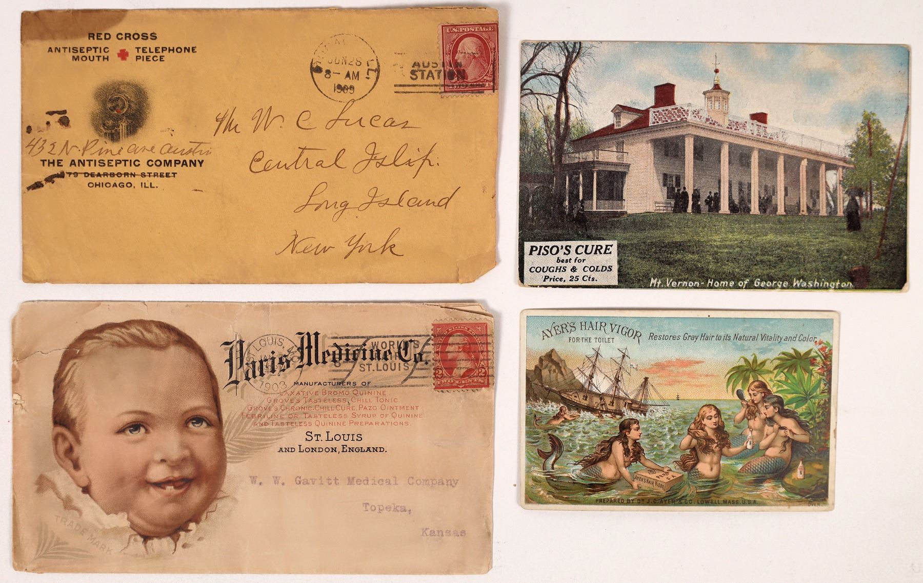 Lot of 4. 1) Paris Medicine Company, St. Louis, 1903, with color vignette of small boy. No contents. 2) Red Cross Antiseptic Company, Chicago, 1909. No contents. 3) Trade card for Ayer's Hair Vigor, Dr. JC Ayers, Lowell, Mass. Vignette of mermaids. 4) Advertising postal card for Piso's Cure, best for Coughs & Colds. Card is of Mt. Vernon. Used, stamp missing.