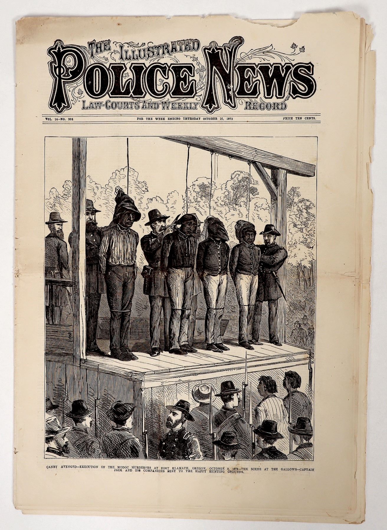 Oct 16, 1873 Illustrated Police News with a dramatic woodcut engraving showing the hanging of Modoc Indian Chief Captain Jack and 3 other Modocs for their participation in the Modoc Indian War of 1872-73. Also prominent inside page stacked headlines and 2 columns of test describing the Modoc Indians in the aftermath of the Modoc Indian War. "The Modoc War was the only major Native American war fought in California and the only one in which a general was killed. It was also one of the most costly wars in U.S. history. According to some estimates it cost $10,000 (about $300,000 today) per warrior to subdue the Modocs in battle. The Modoc warriors totaled between 50 and 60, while there were as many as 1000 U.S. troops at the height of the conflict. The war lasted six months, from November 29, 1872 to June 1, 1873, although tensions leading to the conflict began much earlier. Much of the war was centered around Captain Jack's Stronghold, a natural lava fortress characterized by deep trenches and small caves. The Stronghold was named for the Modocs' war leader Keintpoos, or Captain Jack as he was known to the settlers. Some 150 Modoc men, women, and children lived in the Stronghold for five months of the war, including the harsh winter months. By the war's end, the fatalities included 53 U.S. soldiers, 17 civilians, 2 Warm Springs Scouts, 5 Modoc women and children, and 15 Modoc warriors, five of which were killed in battle. The Modocs who had attacked the peace commissioners were imprisoned at Fort Klamath, where they were tried and convicted of murder. On October 3, 1873, Captain Jack, Schonchin John, Black Jim, and Boston Charley were hanged. Barncho and Sioux had their sentences commuted by President Grant and were sent to Alcatraz. Nearly 2,000 people attended the hanging. The attendance of all Modocs was mandatory." from nps.gov