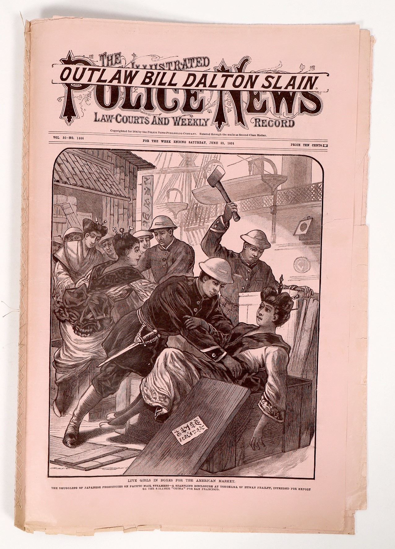 June 23, 1894 sensationalistic scandal tabloid containing a prominent front page headline, " Outlaw Bill Dalton Slain and an inside page 9x7" detailed dramatic woodcut engraving showing Dalton being shot dead by US Deputy Sheriff Hart. A nice display issue showing the violent end of the infamous Indian Territory outlaw. "Even with the demise of the Dalton Gang at Coffeyville, there was one member of the family who still captured the attention and fears of citizens in Indian Territory. Bill Dalton's name was splashed across headlines as continuing the lawlessness that made his brothers infamous. He was called the "worst outlaw who ever stole a horse shot a man in the Southwest!" It is unknown how much Bill was involved with his brothers' outlaw activities. He could not have participated in their first two robberies as he was in jail in California at the time. But Bill did join up with Bill Doolin after the Coffeyville affair to lead what was called the Dalton Gang or the Dalton-Doolin Gang. This band of outlaws continued in the vein of Grat, Emmett and Bob Dalton, robbing the Santa Fe railroad, fighting a gun battle with deputy marshals at Ingalls and robbing the Woodward Station Agent. What made Bill's story slightly different than his brothers was that he was killed several times during his career. Newspaper reports of the Ingalls gunfight had Bill wounded so seriously that he could not live. In April 1894 he was again reported so badly shot up that he would die, this time as a result of a shootout with Deputy William Carr at Sacred Heart mission. Later that same month, Bill Dalton was killed again, this time by a posse of seventeen U.S. deputy marshals. Two years after Bill's actual death he was captured in New York City and then committed suicide in Wyoming. Ironically, the real cause of Bill's death was a robbery in which he was not even personally involved. In May of 1894, the gang held up a bank in longview, Texas, stealing $2,600. They immediately had a posse on their trail, and in the weeks that followed, the robbers eventually crossed over from Texas into Oklahoma, passing by the area where Bill Dalton lived with his family. On June 8, 1894 a posse of lawmen approached Bill's home near Ardmore, Oklahoma. Bill, with a pistol in hand, jumped out of a window and ran toward the posse, ignoring orders to halt. He was killed immediately. This time his wife and two brothers identified the body and shipped him to California for burial." from nps.gov