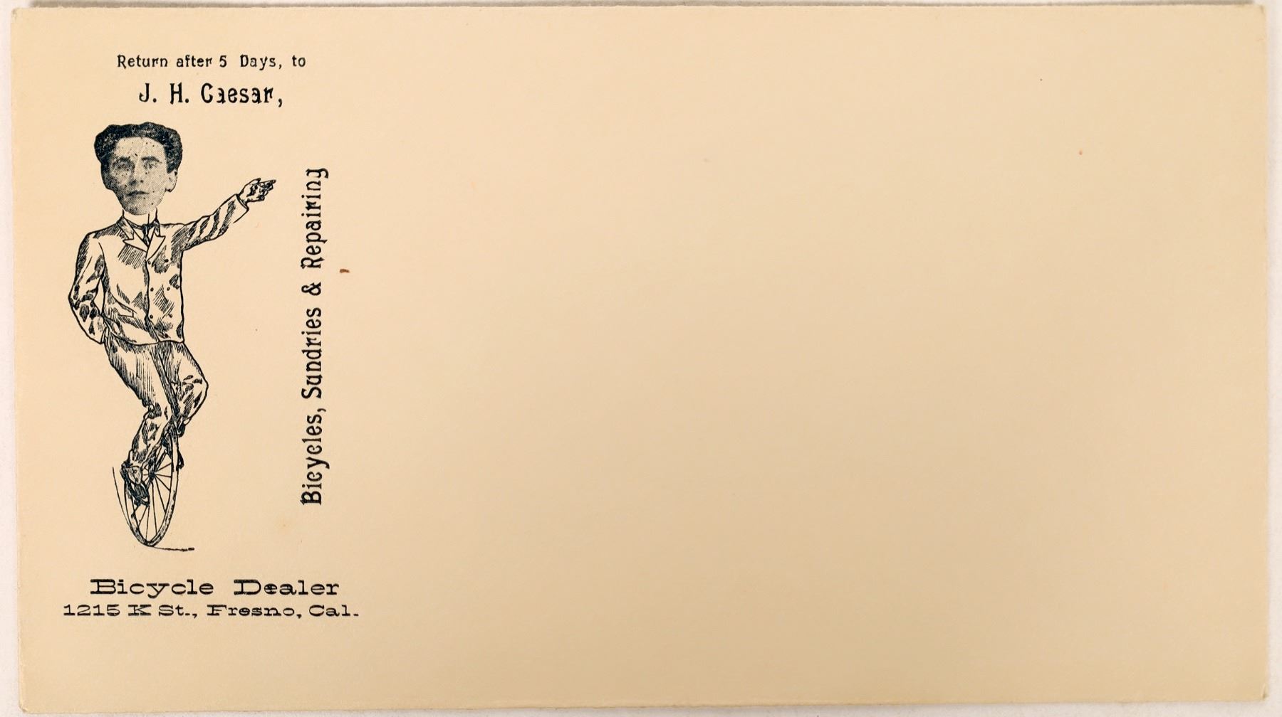 A very rare, illustrated envelope for J.H. Caesar's Bicycle dealership which operated out of Fresno County, California circa late 1800s/early 1900s. Envelope features a drawing of J.H. Caesar on a unicycle with a transfer of his face as the head, dark blue ink for the drawing and text, as well as his business information. Envelope is cream colored and measures 6-1/2 x 3-5/8 inches.