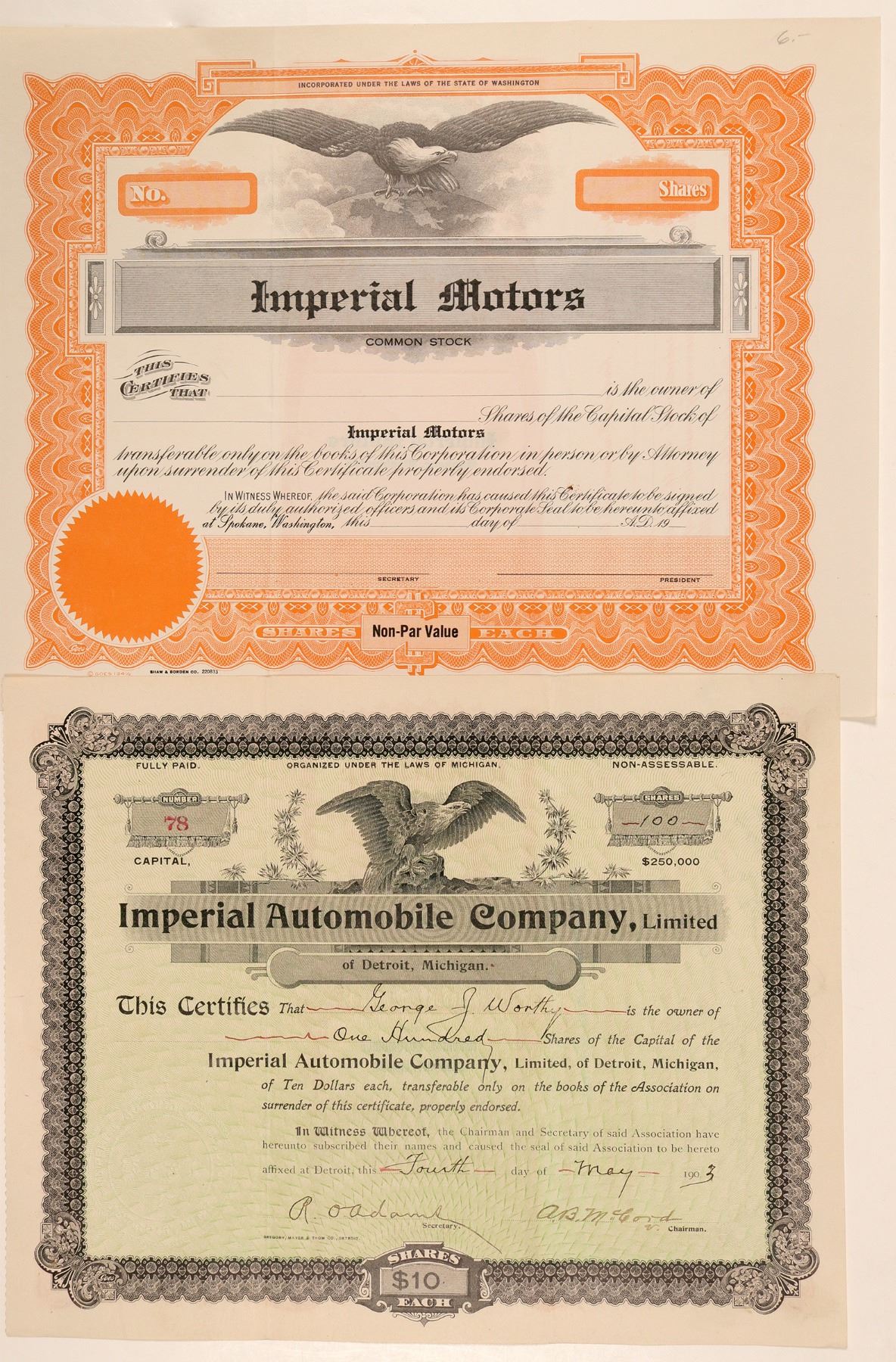 1) Imperial Automotive Company, Limited. # 78 for 100 shares. Signed by AB McCord and RO Adams. Black on green safety paper. Looking at newspapers.com, this company seems to have been incorporated in 1903. It was advertised as the car "That gets there and back." 2) Unissued Imperial Motors. Overall these two certs are in extremely nice condition. Don't forget to check out the Bargains and Dealer Lots section from great deals on automobile stocks. Ken Prag Collection