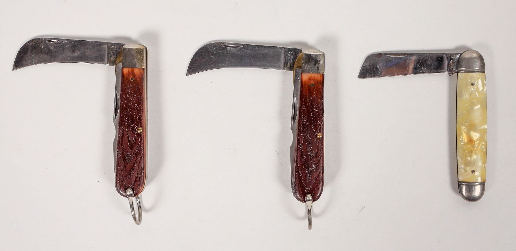 This lot has three Imperial folding knives; two are still in the cosmoline the third is un mother of pearl scales, used, with a factory edge. Please see photos for details.