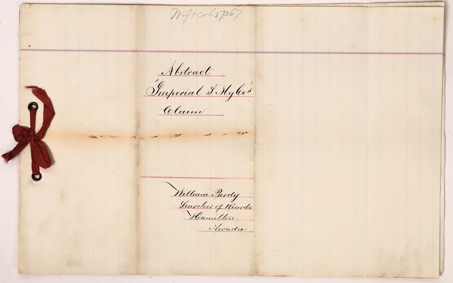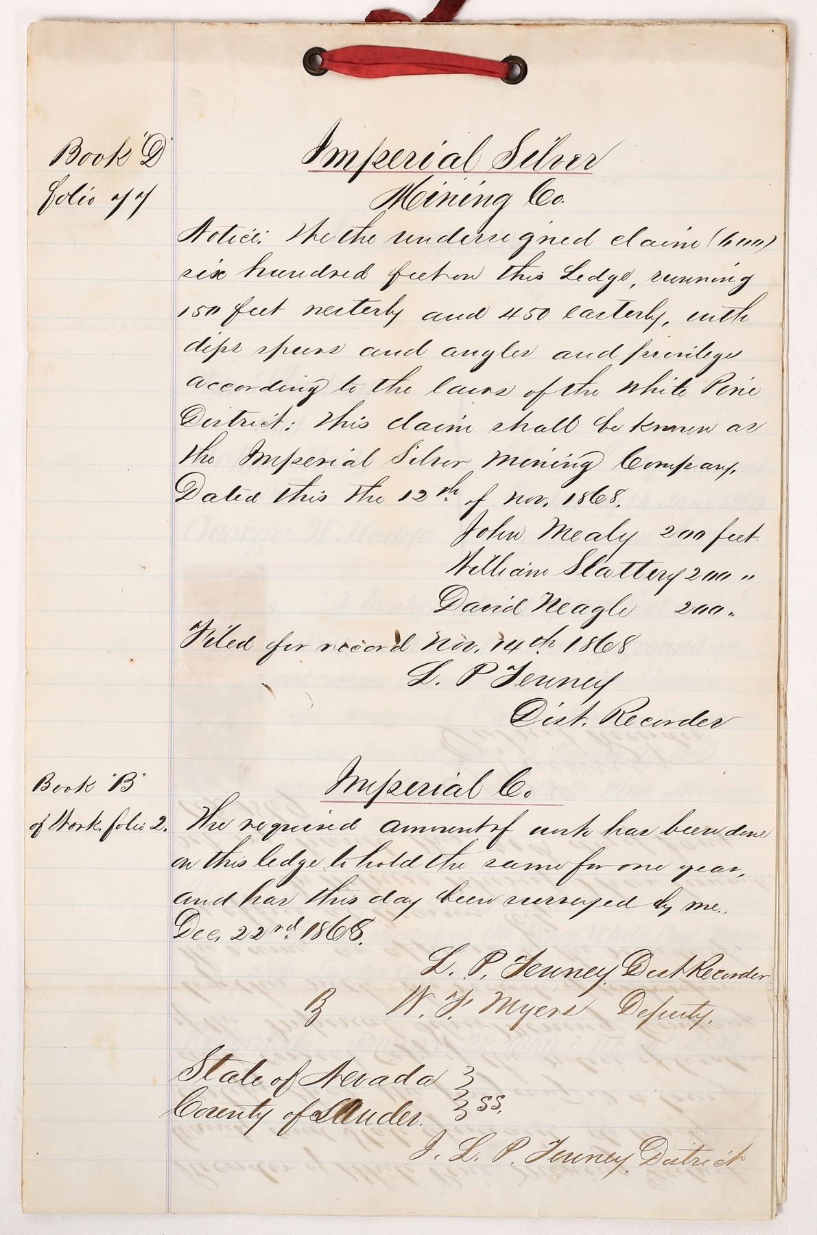 Abstract, title, claim and Conveyances for the Imperial Silver Mining Co. White Pine Mining District, Lander County, Nevada. 8 pages. Starting November 12, 1868 through January 15th 1870, this document records the transfer of claims owned by John Nealy, William Slattery and David Neagle, 200 feet each to the Imperial Silver Mining Co. of White Pine Mining District, Nevada. The first page declares, ìNotice: we the undersigned claim (600) six hundred Feet on this ledge, running 150 feet westerly and 450 feet easterly, with dips, spurs and angles and privileges according to the laws of the White Pine District. This claim shall be known as the Imperial Mining Company. Dated this 12th of Nov. 1868." Document has three Nevada green 5 cent revenue stamps (back of page 1, page 4, and page 7). 8 x 12.5" White Pine Mining District Nevada Franklin Collection
