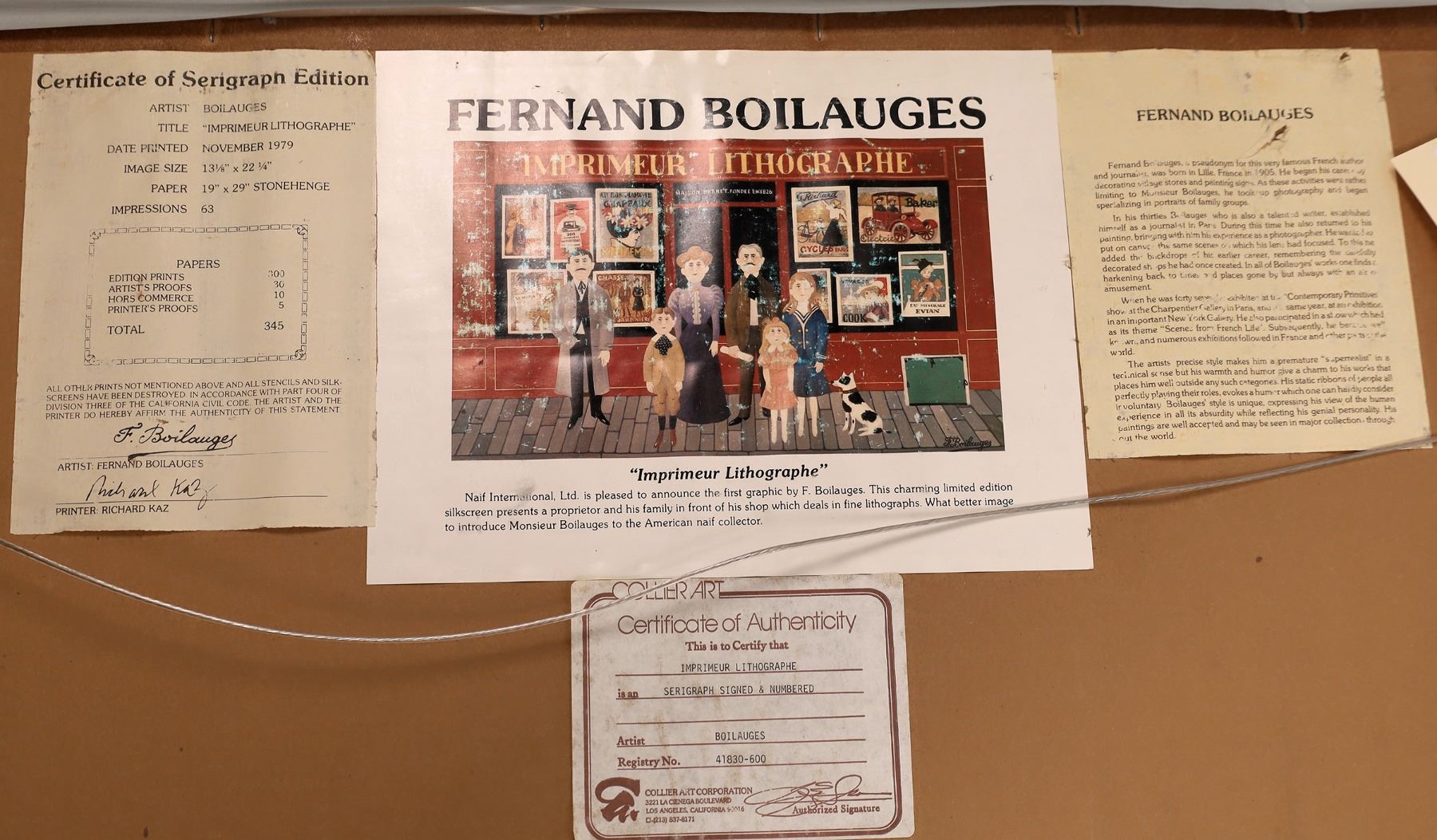 This serigraph print is titled "Imprimeur Lithographe" by French artist Fernaud Boilauges numbered 133/300 and stamp signed by F. Boilauges. The print measures 24 in. X 15 in., it is triple matted in red, with white linen fabric. Overall dimensions are 35 in. X 26 in. in a gold tone frame. Please see photo for details.