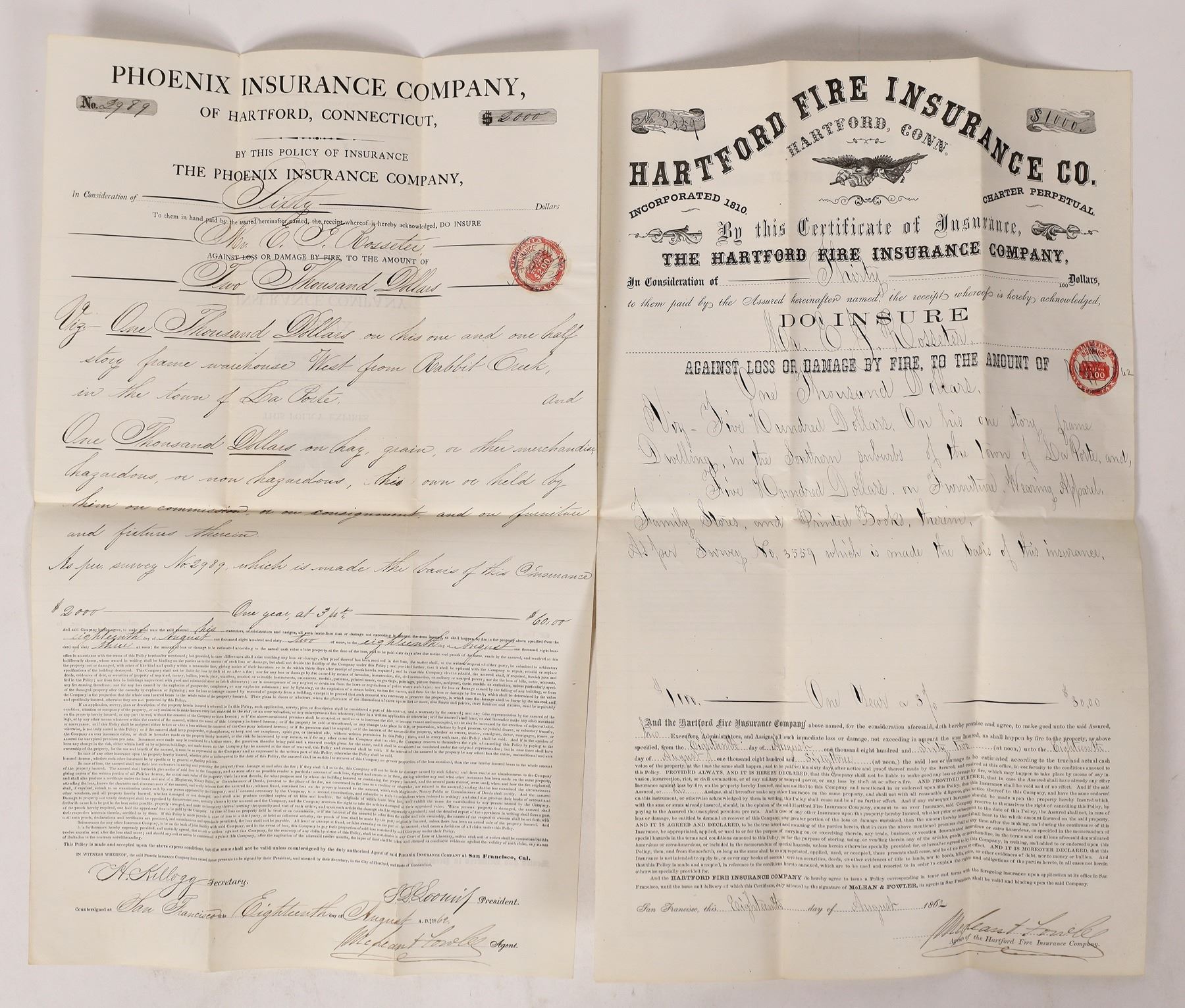 Imprinted California $1 and $2 stamps on 2 1862 insurance policies. Policies issued to Rosseter, a freight and warehouse business in La Porte. California
