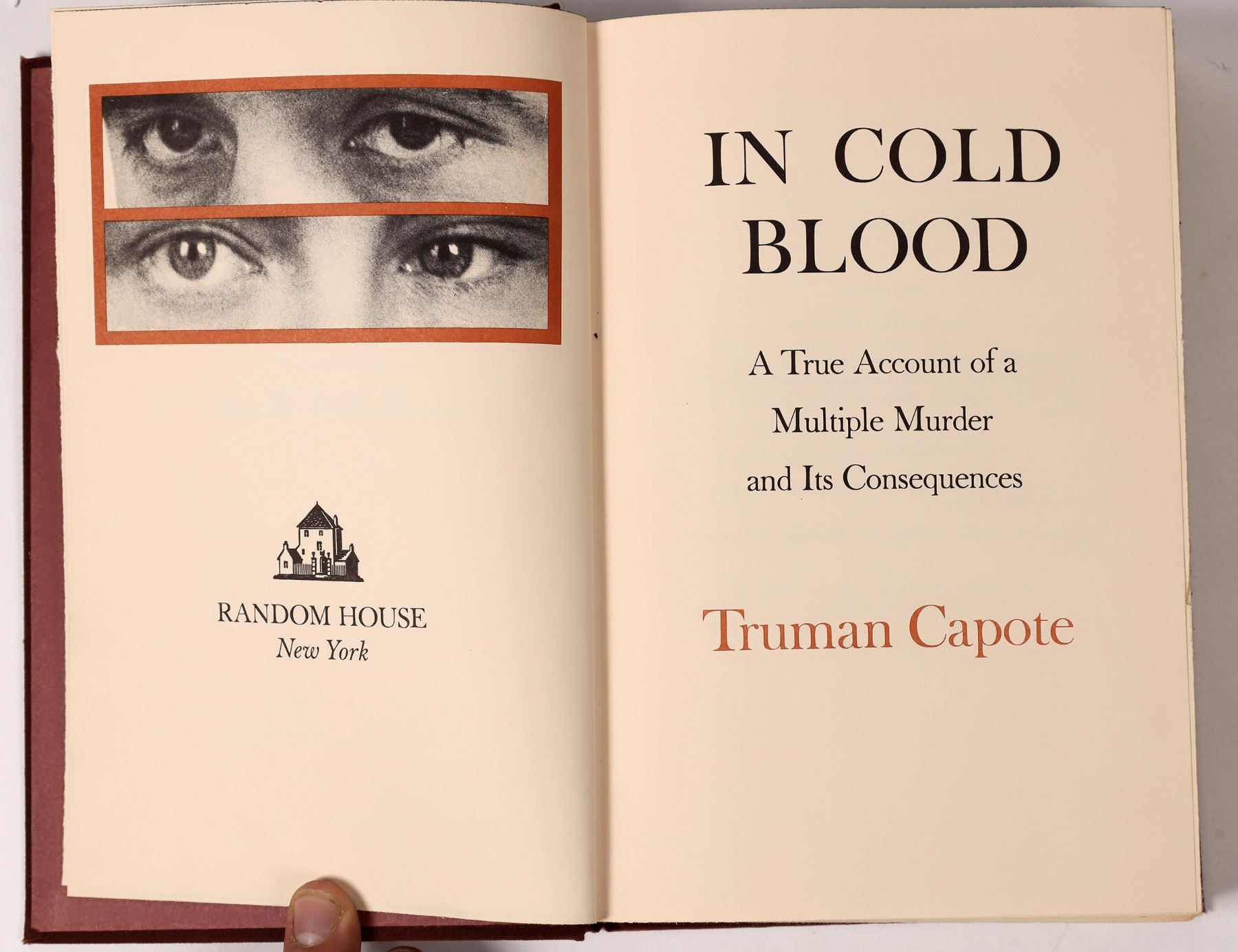 Book titled In Cold Blood: A True Account of a Multiple Murder and Its Consequences. Written by Truman Capote and published by Random House in 1965. This non-fiction novel is the second-best selling true crime novel in history. It is about a murder of four family members in rural Kansas. Capote wrote this book using notes from interviews conducted by himself and Harper Lee (best known for To Kill a Mockingbird). This copy is in good condition but does not have a dust jacket. 8.5 x 6, 343 pages.