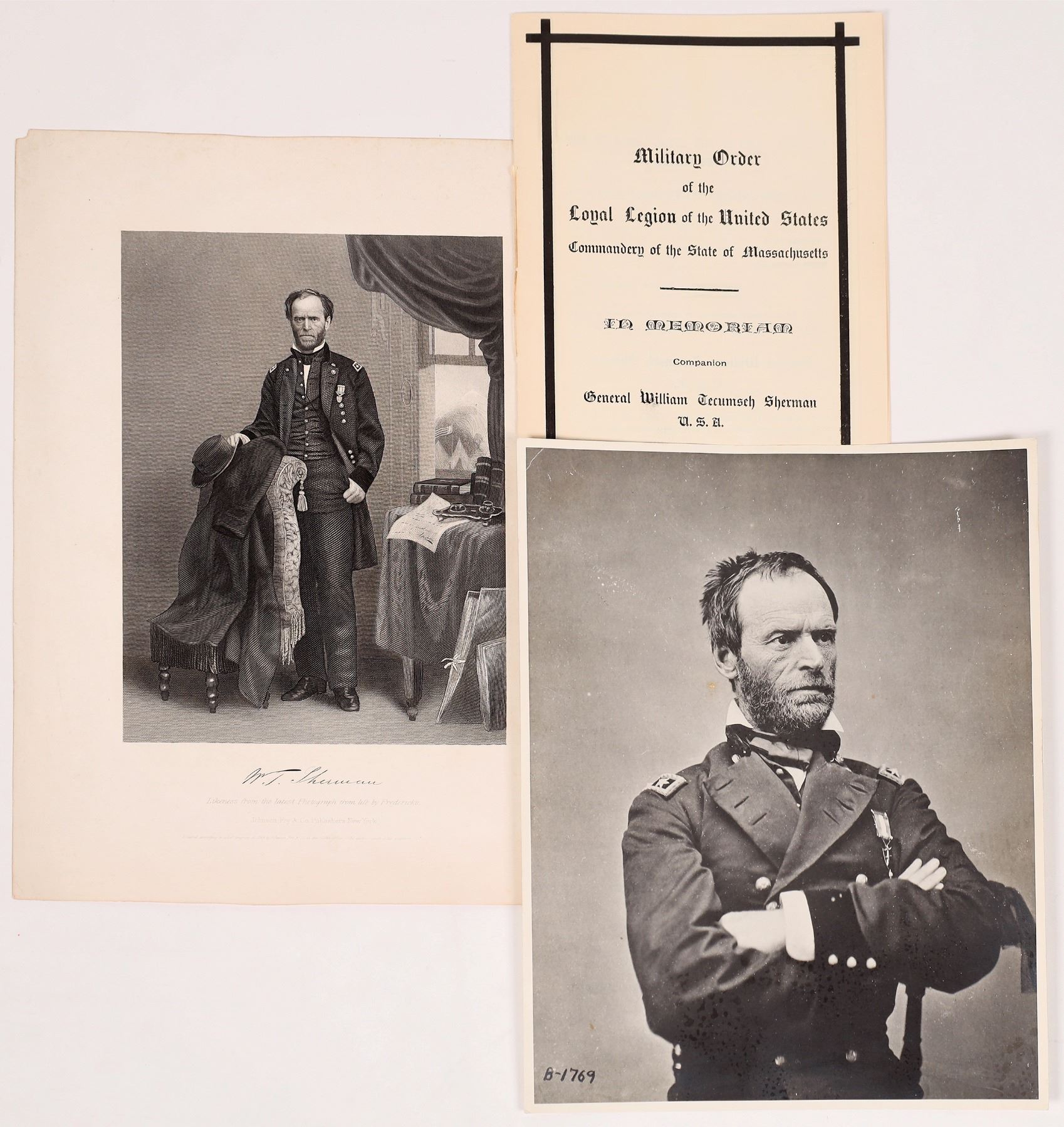 This memorial speech written at the time of General William Tecumseh Sherman's death in 1891 includes a copy of his hand written letter to the Governor of Louisiana on the18th of January, 1861 proclaiming his loyalty to the Old Government of the United States and that the governor "should take immediate steps to relieve me the moment that the state determines to secede." This would be Sherman's defining moment. This eulogy was presented by the Military Order of the Loyal Legion of the State of Massachusetts in Memoriam for Companion General William Tecumseh Sherman April 9, 1891. This is four pages of the eulogy speech with two pages of the copy of Sherman's letter to the governor. Accompanying this document are two likenesses of Sherman; one is an etched copper plate of the General in his blues wearing the usual scowl. ( 8 1/2 in. X 11 in. Johnson, Fry & Co. N.Y.) And the other is a National Archived photo 7 1/2 in. X 10 in. series B-1769. Sherman always appeared with this familiar scowl as a lasting reminder of the uselessness of the Civil War. He also planned for a cannon from Fort Sumter to be placed at the entry to the Military School at Louisiana Sate University where he taught; as a reminder to forever stay loyal the United States Government. The cannon is still there. Massachusetts