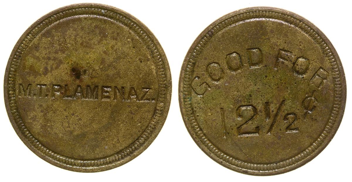 M T Plamenaz // GF / 12 1/2c. Round Brass. Nice specimen. City: Candelaria State: Nevada Date: hwac# 33283