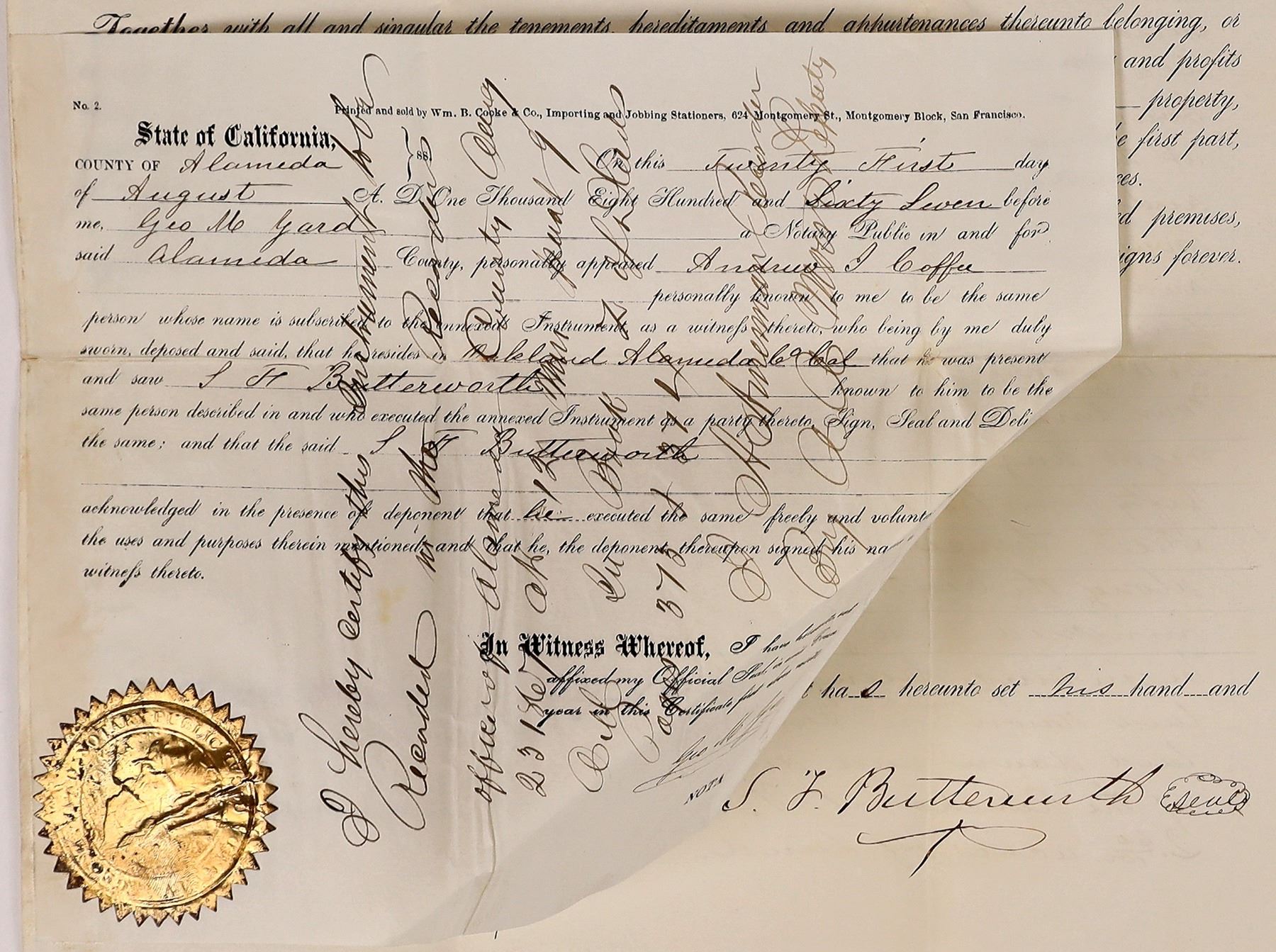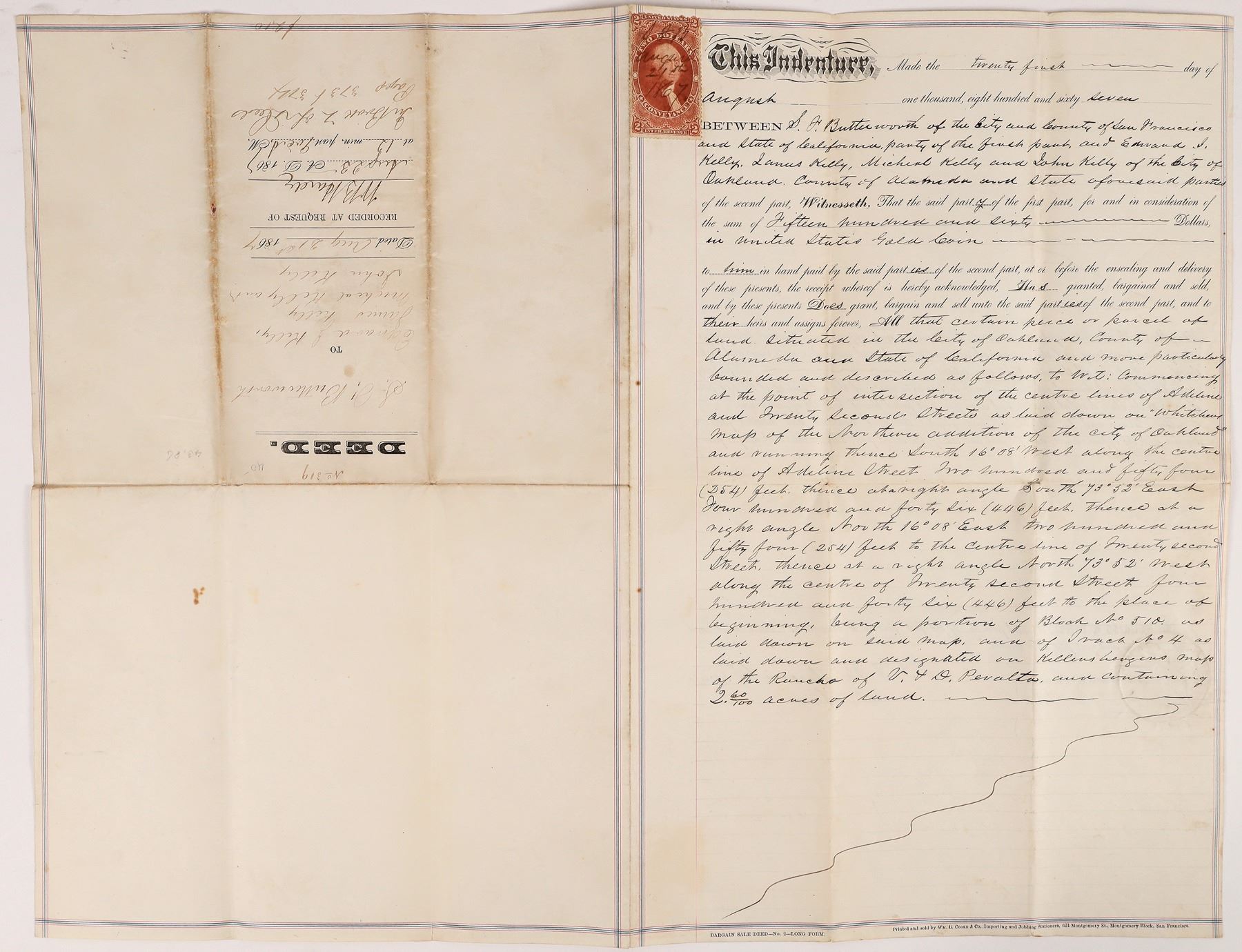 1867 indenture between S.F. Butterworth of San Francisco and the Kelly Family of Oakland for a piece of land in Oakland at Adeline and 22nd streets for $1560 in gold coin. R81-R8 Red $2 conveyance Internal Revenue stamp attached at upper left. Signed by Samuel Butterworth. 16 x 10.5" In 1864, Samuel F. Butterworth came west to take over the New Almaden Mining Company down in San Jose. His company, The Quicksilver Mining Co. of New York had been in a legal wrestling match for years trying to obtain the San Jose based mercury mine at New Almaden. The case involving old Mexican land grants and obscure borders was finally escalated to the Supreme Court where they found the paperwork surrounding the grant faulty. After post-trial arbitration the company sent Butterworth to take over the mining operations as superintendent in 1864. Previously he had been in charge of the New York Assay Office and was a noted Tammany Hall operator.